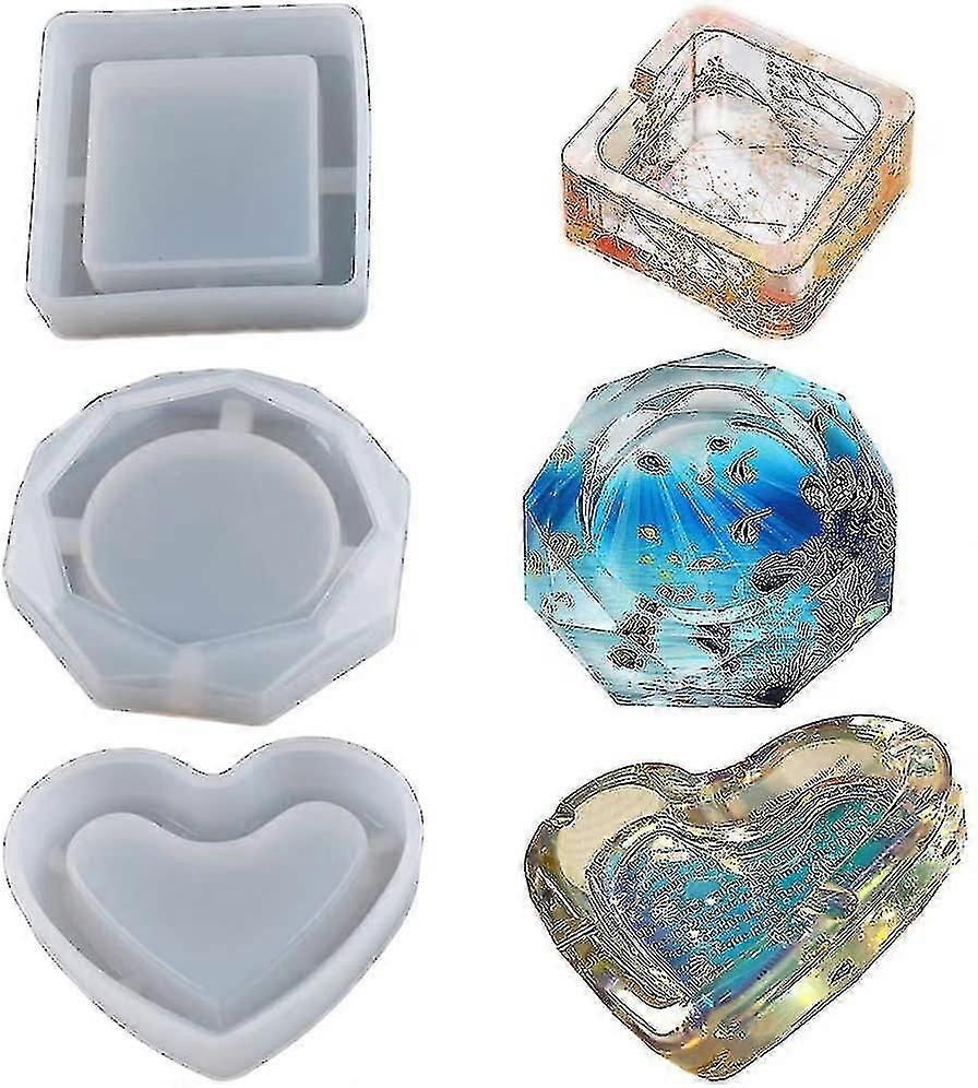 Epoxy Resin Silicone Molds Ashtray (3 Pack Ashtray Resin Silicone Mold Pack:includes 1x Square Ashtray MoldSize:L*W*H: 3.7inchesx3.7 inchesx1 inches1xHeart Shaped Ashtray MoldSize:L*W*H: 4.8 inchesx3.6 inchesx1.1 inches 1xRhombus Shape Ashtray MoldThe diameter is 4.5 inches and the height is 1.3 inches.High Quality: These casting molds are made of high-quality silicone material, durable and not easily deformed and super easy to clean, non-toxic and non-irritating.Easy to De-mold: Smooth interior makes it easy to de-mold after its fully cured and no need extra cutting and edging. You can use a release spray or soapy water to release the mold, which will help Helps protect Ashtray mold.Perfect Ashtray Mould:Compare to buy ashtray, you can play your imagination into the ashtray you want.You also can add dry flower, pearl pigment, mica powder, glow in the dark powder, glitter and sequins into the resin mold to get a colorful mold. It is the perfect DIY tool.Package Inculde:1 Pcs Square Ashtray MoldSize:L*W*H: 3.7inchesx3.7 inchesx1 inches.The weight is 78g1 Pcs Heart Shaped Ashtray MoldSize:L*W*H: 4.8 inchesx3.6 inchesx1.1 inches.The weight is 72g1 Pcs Rhombus Shape Ashtray MoldThe diameter is 4.5 inches and the height is 1.3 inches.The weight is 120gPlease allow Tiny measuring error due to manual measurement. Thank you for your purchase.