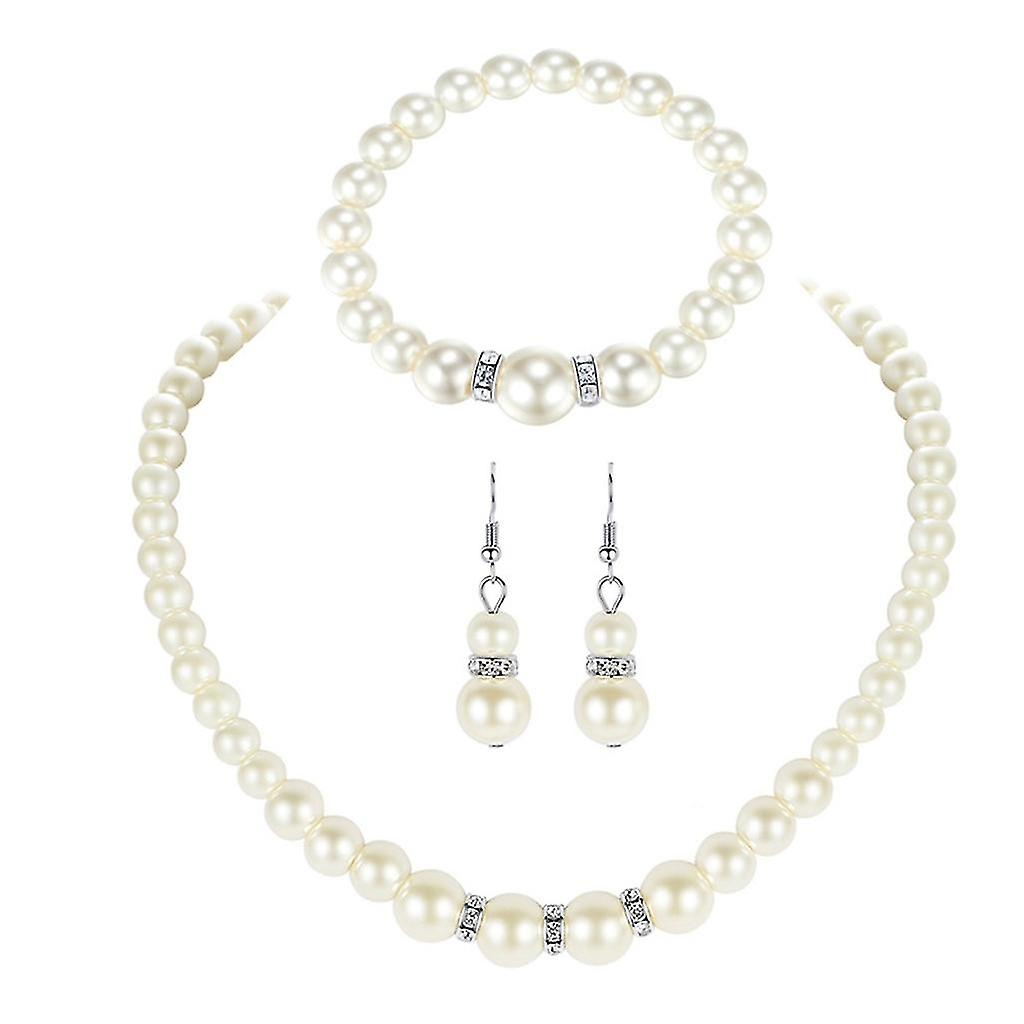 Elegant white faux pearl necklace earrings and bracelet women's jewelry set
