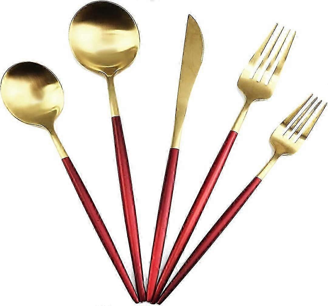 Elegant Red Handle 5-Piece Matte Gold Cutlery Set