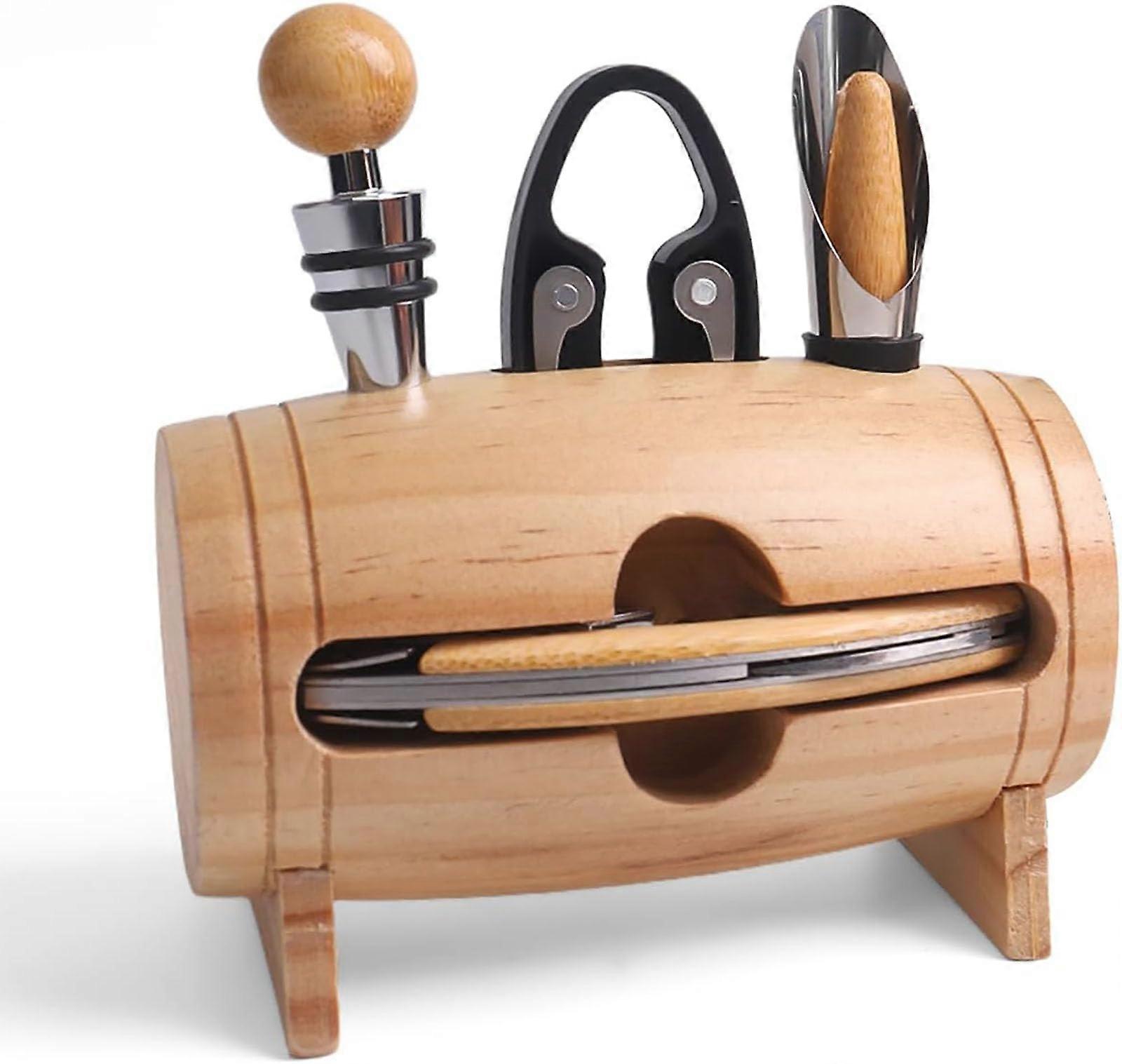 Elegant Wine Gift Set Wooden Barrel with Corkscrew, Foil Cutter, Wine Dummy and Stopper for Men Sommelier Accessories, Wood