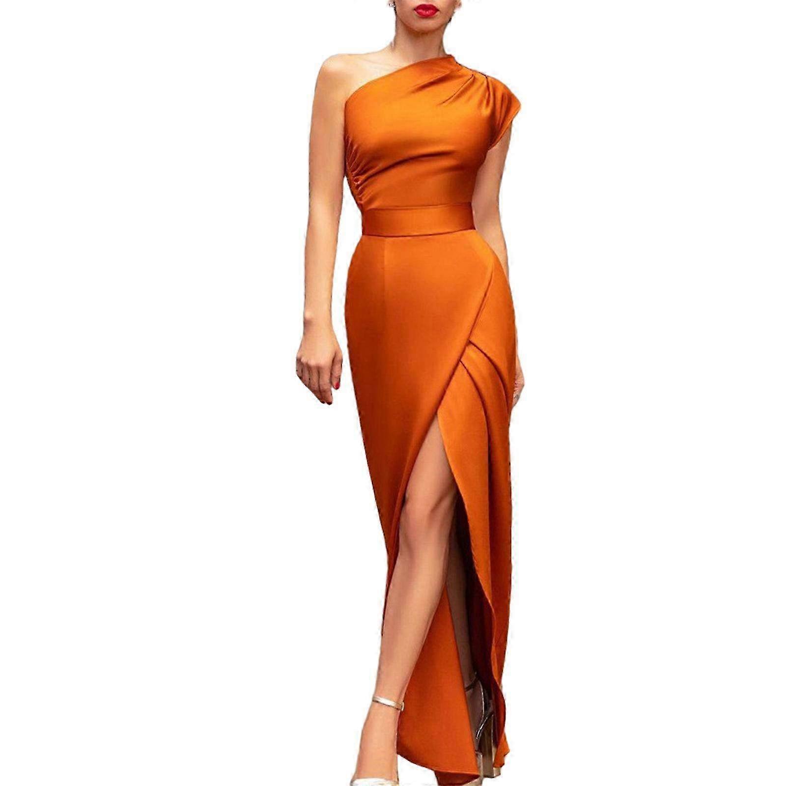 Elegant One Shoulder High Waist Split Dress for Women, Party & Special Occasion Dresses in Orange Size L