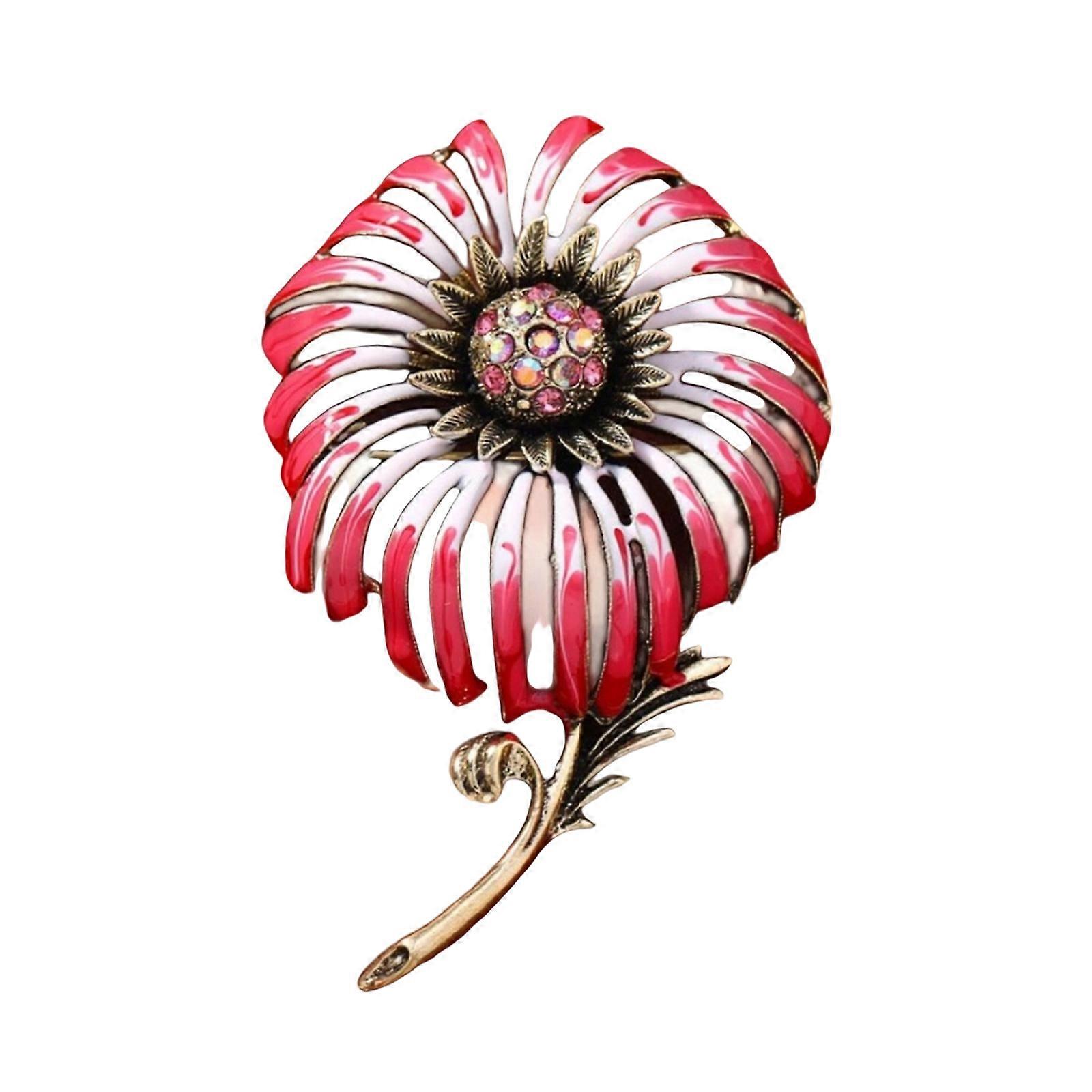 Elegant Floral Brooch Vintage Dandelions Design Gold Tone Enamel Finish Curled Petals AB Crystal Cluster Stylish Jewelry Red