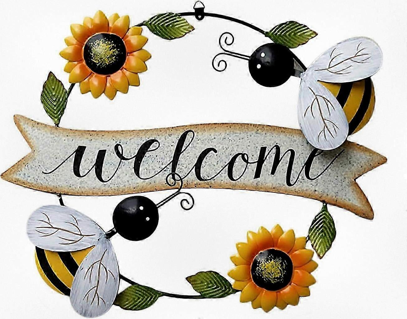 Hand-painted front door welcome sign featuring sunflowers, bees, and "Welcome" lettering. Includes a hook for easy wall hanging. Versatile metal wall decor suitable for indoor and outdoor spaces like gardens, patios, or living rooms. Makes a thoughtful gift with its high-quality packaging and charming sunflower-and-bee design. Realistic metallic bee details add a decorative touch to your yard or garden. **Details:** - Material: Iron - Color: White - Size: 30 x 39 cm - Includes: 1 welcome sign