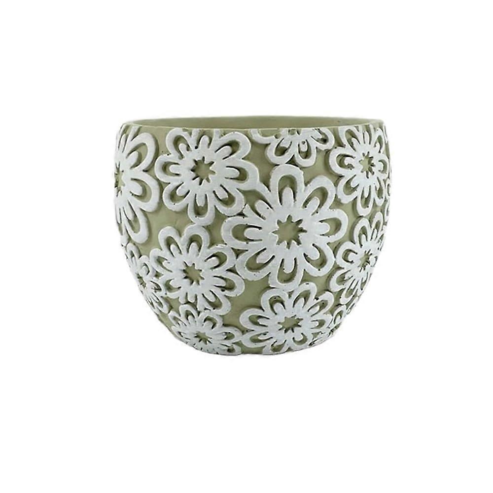 Round Cement Flower Pot with Embossed Pattern, Green Background and White Flowers, Medium Size with Drainage Hole for Balcony, Garden, Office