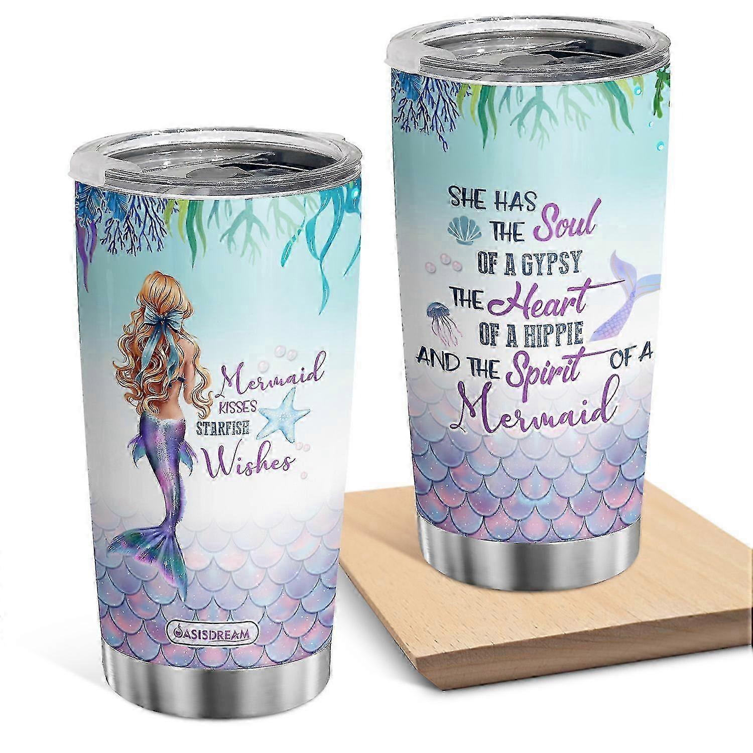 Oasisdream 20oz Mermaid Kisses Starfish Tumbler with Lid Double Wall Travel Coffee Cup