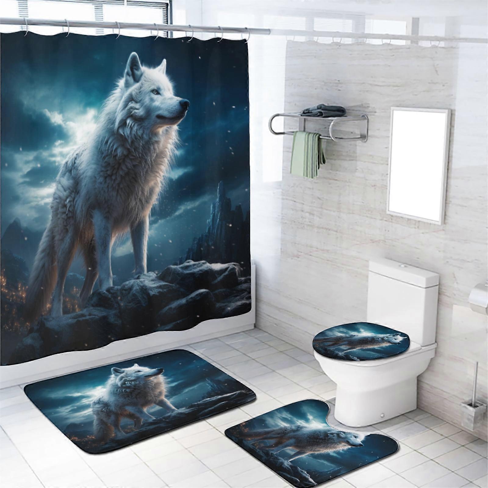 Wolf Shower Curtain Set with Rugs, Compatible with Bathroom Decor, Forest Animals, Starry Night, Includes Toilet Cover & Bath Mat, 72x72