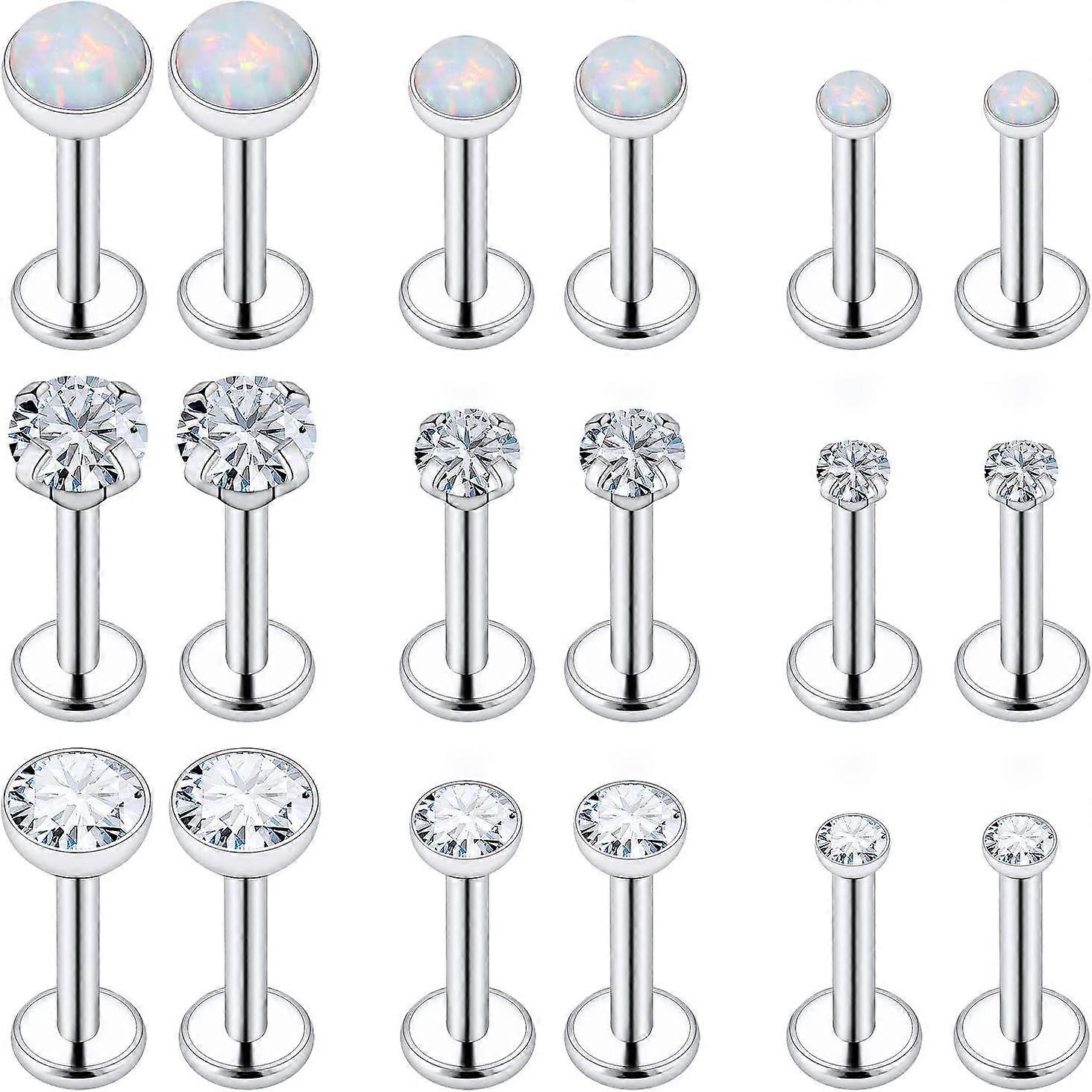 MULTIFUNCTIONAL: They Can Be Used as Earrings Stud, Tragus Piercing Jewelry, Tragus Earrings for Women, Forward Helix Earrings, Triple Helix Piercing Jewelry, Conch Piercing Jewelry, 16g Cartilage Earring, Flat Back Cartlidge Earrings, 16g Nose Rings Studs. UNIQUE SETOne Order Includes 9 Pairs of Internally Threaded Labret Studs in 3 Styles(Opal,Prong Round CZ,Round CZ). It Comes in Different Sizes So You Can Choose the Size That Best Fits You. Convenience and Ease of Internally Threaded Jewelry Makes It Compatible with Virtually Every Piercing Type. MATERIAL: Made of High Quality 316L Surgical Stainless Steel, Hypoallergenic, Safe for Sensitive Skin. High Polished Smooth Surface Prevents Skin Damage and Makes Healing Process Comfortable and Painless. MEASUREMENTSGauge: 16G (1.2mm); Post Length: 6mm (1/4"), 6mm Post Length is More Suitable for Wearing on the Ear; Opal/CZ Size: 2mm,3mm,4mm; Color: Silvertone. SATISFACTION GUARANTEE: All Items are New and Unused. Please Contact Us If You Have Any Problem. Come with a Black Velvet Pouch. Great gift for Birthday, Christmas Day, Anniversary Day, Valentine's Day, Wedding and Vocation Party and more.