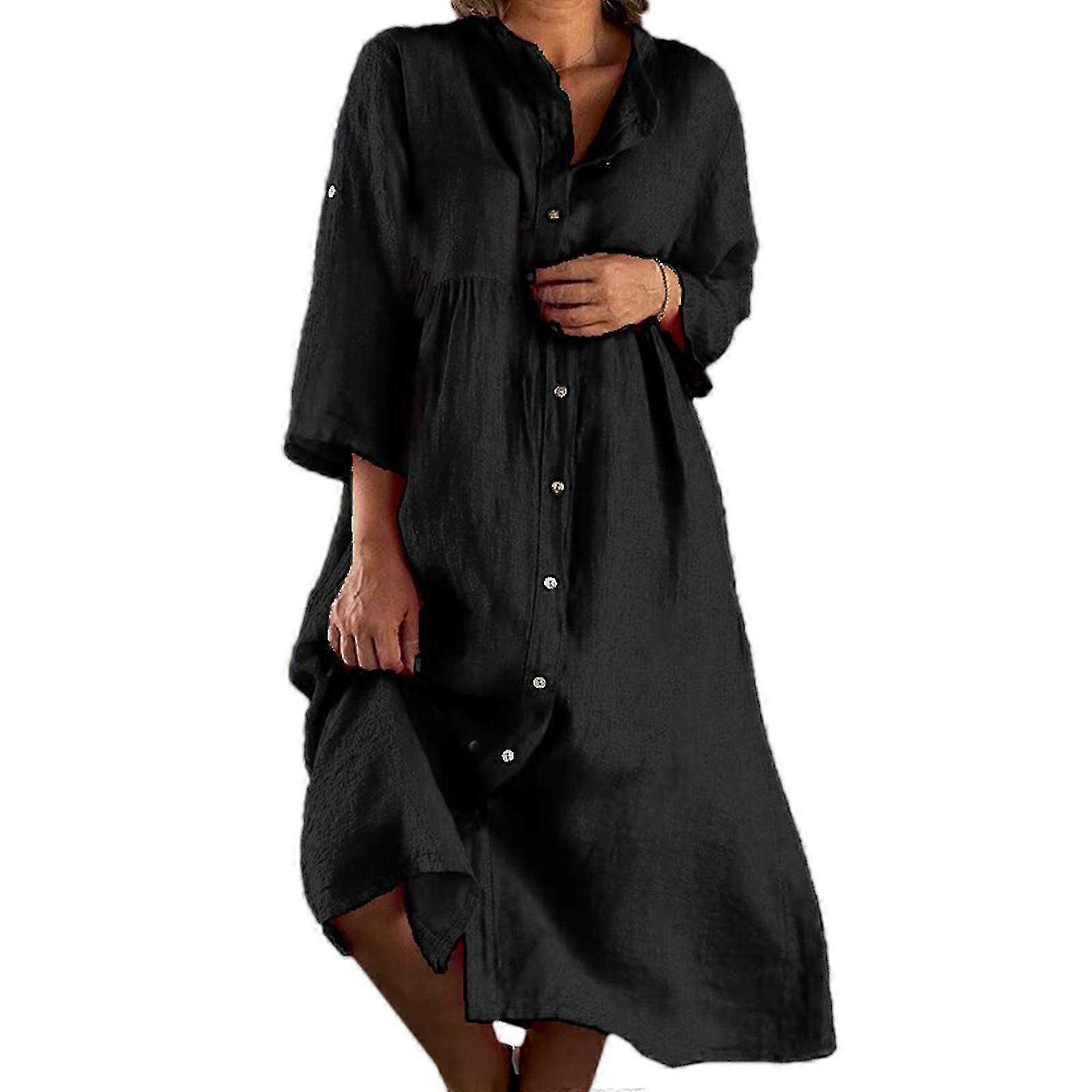 Versatile Women's Solid Button-Up Dress in Breathable Cotton Linen for Office or Casual Wear, Comfortable and Stylish Black Dress