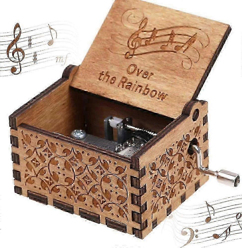 Music Box, Over the Rainbow Music Box Vintage Engraved Wooden Musical Boxes Hand Cranked Small Music Box