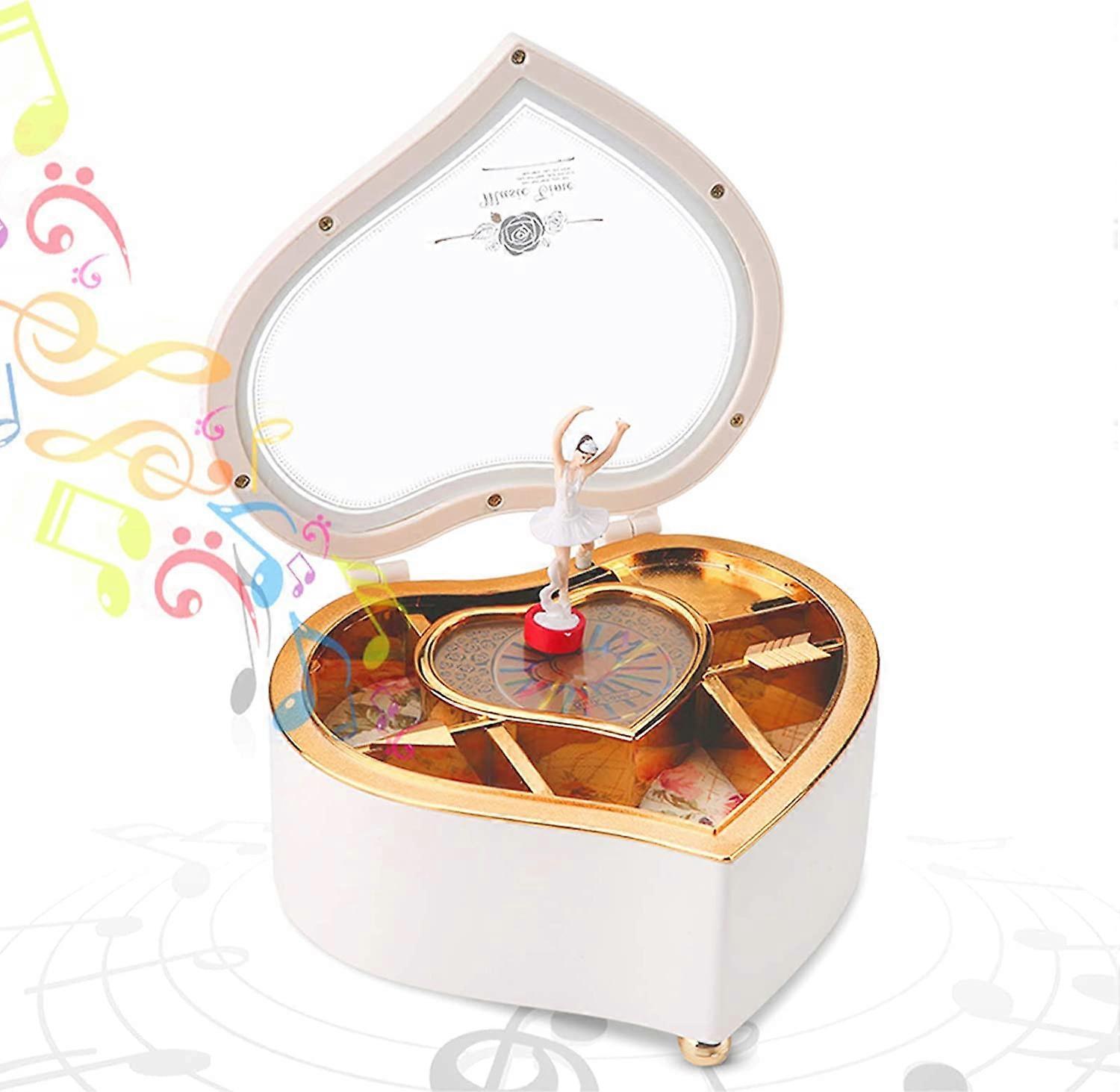 Heartshaped music box with removable magnetic dancer decoration, beautiful and unique. Multifunctional design, can be used to place small jewelry, such as pins, pendants, rings, earrings, etc. Cute and innovative music box, exquisite workmanship, suitable for desktop decoration. Please put the dancer decoration in correct position, check the position of heart magnet, and avoid the music out of tune. It can emit beautiful and sweet music, which is an excellent Valentine's Day gift. Spec: Item Type: Music Box Material: Plastic Music Song: Random Music Package List: 1 x Music Box 1 x Ballet Girl Accessory