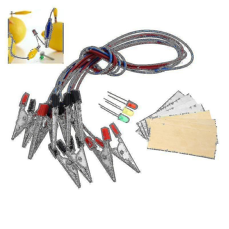 Fruit Battery Light Diode Science Kit Orange Potato Lemon Battery Physics Teaching ExperimentDescription:Looking for a fun, easy science experiment for kids? This fruit battery project is a science fair classic, and a great addition to a classroom lesson plan. Let's make it step by step:Instruction:1. Firstly , take 4 Lemons(other fruits like apple, orange, potato also OK).2. Push 2 metal plates (one copper, one zinc) into each of them, connect copper plate of a lemon to zinc plate of another lemon with wires. 3. Then, connect wire from copper plate of first lemon to long terminal(+) of LED (light emitting diode).4. Also connect wire from zinc plate of last lemon to short terminal(-) of LED.You will find that the LED growsPackage Included:4 x Copper Plates4 x Zinc Plates3 x Light Emitting Diodes5 x Electric WiresMore Details: