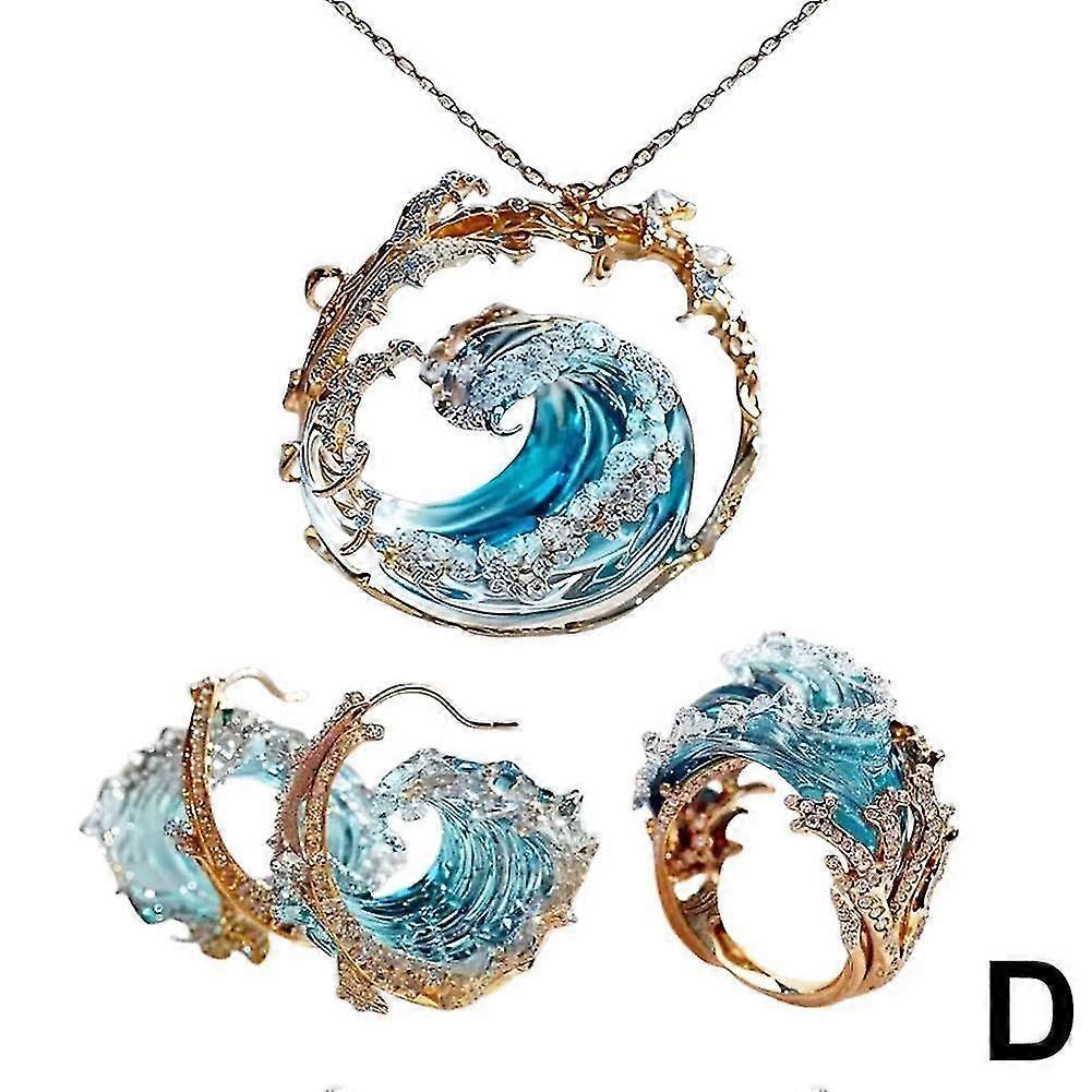 Ocean's Oath Jewelry Set, Boho Blue Ocean Wave Necklace Earring Rings