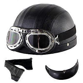 Motorcycle Scooter Open Half-face Leather Helmet With Anti-uv Goggles Retro Vintage Style 54-60cm