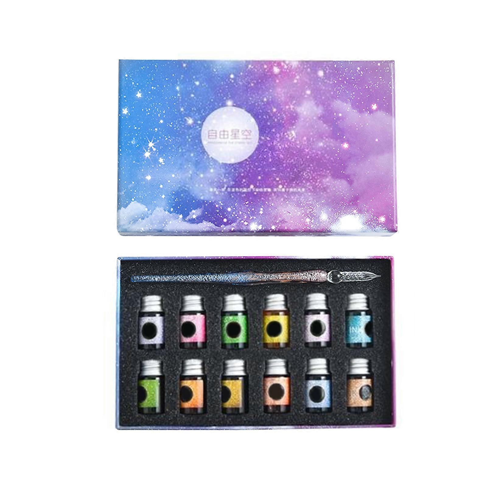 Glass Dip Pen and Ink Set - 12 Ink Bottles with Pink Gradient Pen
