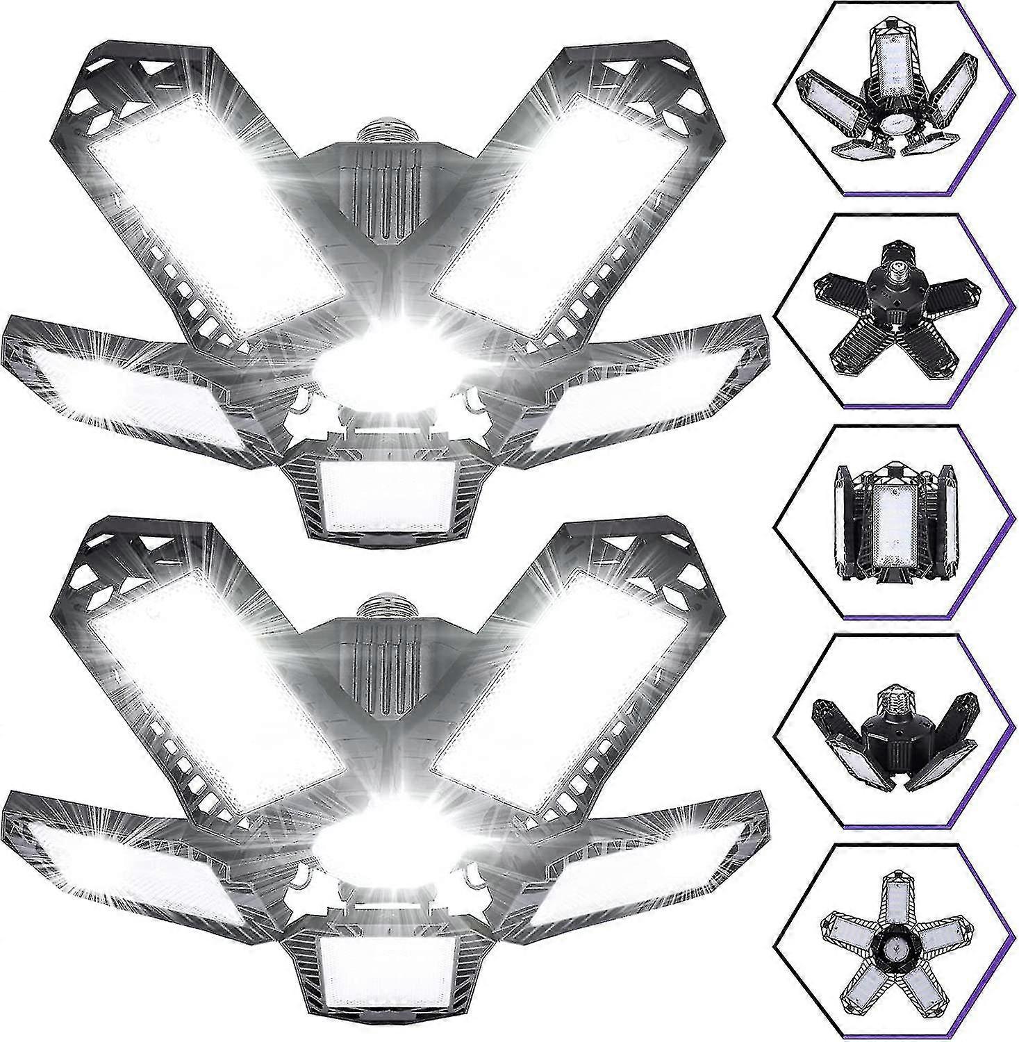 Illuminator 360 Garage Light & Downward Central Panel Garage Light has five deformable LED panels and a downward central panel as a truely 360 illuminator, no more shadow on the central lighting when 5 panels are all folded up to 90. This 5+1 panel LED garage light is a better choice than ordinary light bulb that compatible to E26/E27 ceiling socket but generates more brightness.High-end Garage Light LED Chip & 85% Energy Saving 10000 lumens 6500k daylight, this garage light generates a steady and super bright lighting, no glare or dim brightness. CRI 80+ of the light, let everything in a natural look like under daylight. With 135Pcs high-end beads, SMD 2835 high efficiency Chips, saves 85% energy for your garage. Higher light efficiency, lower power consumption, more energy savings, then cut down your cost.Durable Raw Material & 50,000 Hours Lifespan Deformable garage ceiling light is made of high-quality ABS and lamp Beads. LED Garage Light has faster heat dissipation performance, with durable roller for thounsands of folding for panels case all these make the light last for a 50000hrs lifespan. Mind: When the garage lights are working, please DO NOT touch panels by hands directly, in case of getting scalded.Easy Installation Like Bulbs into E26/E27 Base The installation of this deformable Garage Ceiling Light is very convenient, preparing an E27/E26 ceiling socket, no need any tools, wiring or even hiring expert electricians. just screw this garage light into the ordinary lamp holder. Few seconds work. Saves a lot time for you.What You Get & Wide Application 2 * LED Garage Light, 1* User Manual, 2-years war-ranty, 24 hours online customer service. Super bright lighting tool for garage, warehouse, workshop, basement, laundry room, shed, attic, shops etc. Buy with confidence If there is any quality problem with the garage light, please let us know via Amazon.Advantages over other garage lightsCompared with classic garage lights, this garage light is made of high-quality plastic, lightweight and easier to hold up for installation, fast heat dissipation and safer for home use. Same high-quality LED beads and same brightness but lower cost, higher quality-cost ratio. Just Get It Now.