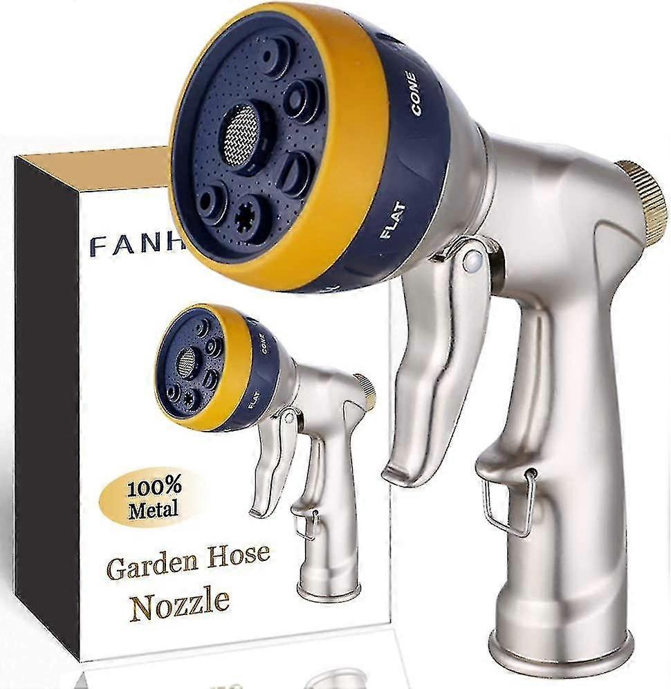 1. Upgraded Hose Nozzle - Metal Material: This hose nozzle is heavy-duty, with its main body and trigger made of zinc alloy. It has a well-designed structure, which helps prevent water leakage, rust, corrosion, and wear, and it is more durable than plastic nozzles. It comes with a shockproof rubber border dial to protect the sprayer from damage caused by accidental drops.