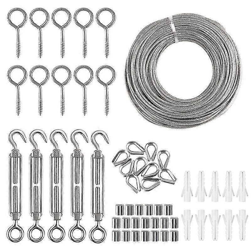 Multi-purpose 2mm Wire Rope Kit: 2mm Garden Wire for Climbing Plants with Turnbuckle Wire Tensioner Kit can get a wide range of heavy duty tasks done and allow more flexibility in use,including plant training wire kits,wire for climbing plants support,rose wire support,outdoor light strings hanging,catenary wire kit,espalier wire kits,wire trellis kit,wisteria wire kit for walls,patio curtain wire,pergola wire kit,straining wire,clothesline kit,...;stainless steel Turnbuckle Kit in pack perfect for fence wire tensioner ,garden wire teniosner,DIY balustrade wire kit,outdoor cable railing,cable tightener...