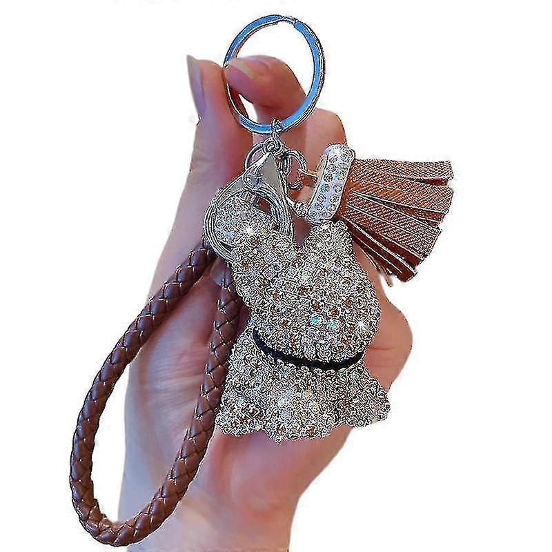 Girls Fashionable Luxury Diamond Teddy Bear Pendant Key Chains Leather Tassel Rope Rhinestone Keyring (brown)