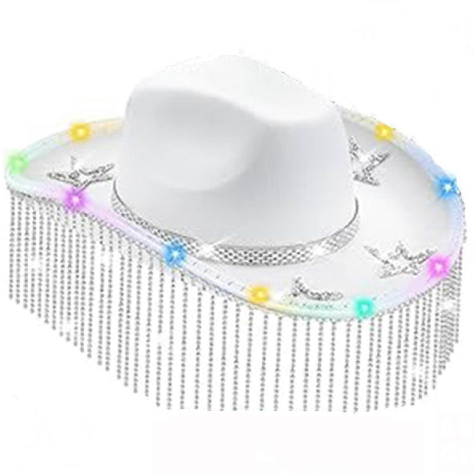 Cowgirl Hat Panama Light Up Cowboy Hat Glowing Panama Hat for Music Festivals Sparkly Crystal Tassels Cowboy Hat Versati White