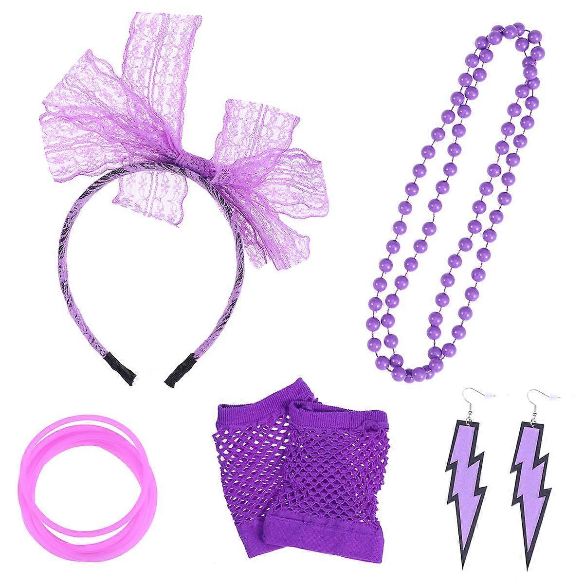 80s Style Dress Up Accessories Set For Adults Featuring Colorful Bracelets Necklace Earrings Lace Headband And Fishnet Gloves 5-Piece Set