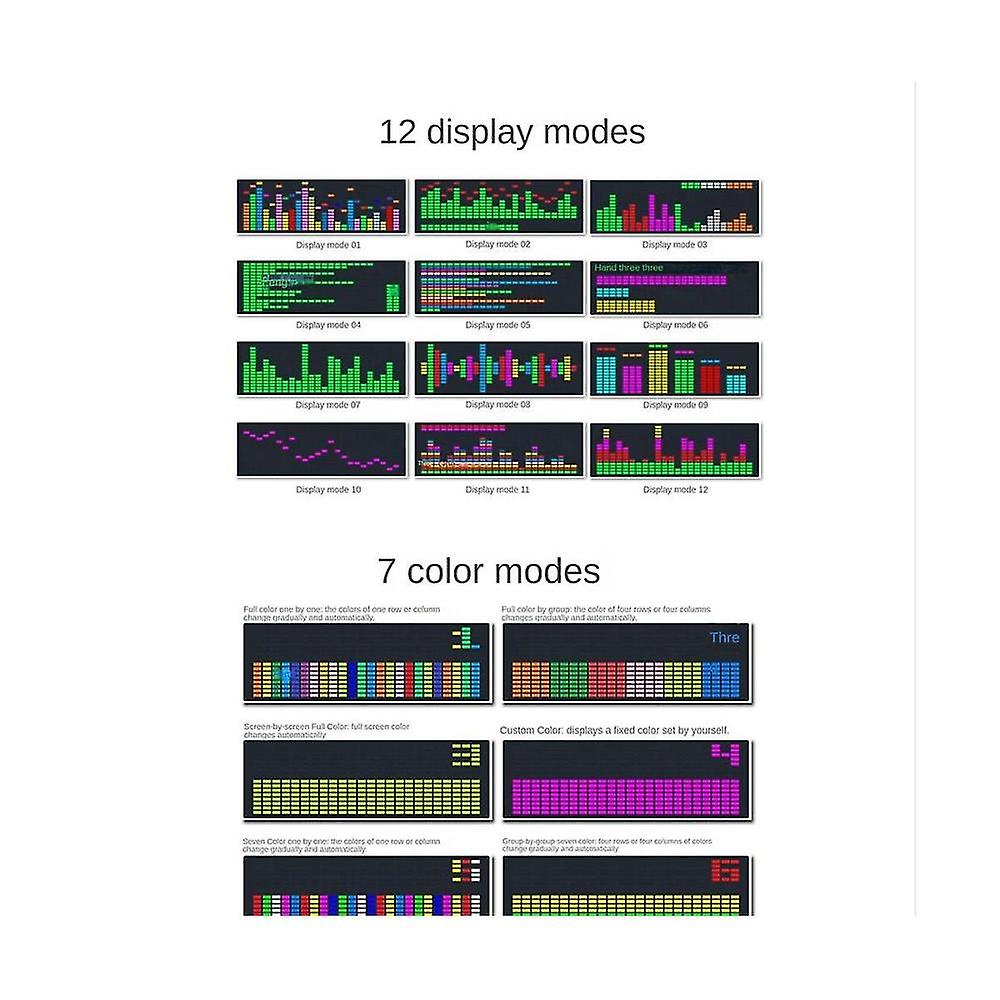 Product function: 1. Sensitive pickup of surrounding sound, automatic switching of voice control+remote control 2. 12 display modes and 7 color modes can be combined into 84 display effects 3. 8 brightness modes. 4 time display modes 4. 1 breath display mode. 3-way alarm clock function 5. You can set your favorite color. USB power supply (available with 5V mobile phone charger) Product name: 1624 color LED music spectrum Product model: -256 Display mode: 384 RGB in 16 columns and 24 rows Rated power: 3W Power input: USB 5V 1A Product size: 21.8cm long, 2.8cm wide; 7.2cm high Control mode: voice control or 3.5mm audio line control, automatic switching. If no audio line is inserted, it is voice control. If the audio line is inserted, it will automatically switch to audio line control. color:Black Material:ABS Package Contents: 1 x Color LED music spectrum electronic clock 1 x USB cable 1 x 1/2 audio adapter 1 x 3.5mm male to male audio cable Only the above package content, other products are not included. Note: Light reflection and different displays may cause the color of the item in the a little different from the real thing. The measurement allowed error is +/- 1-3cm.