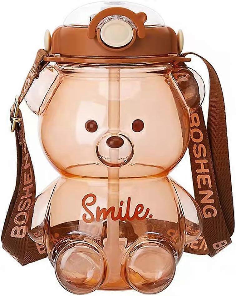 Kawaii Bear Water Bottle with Straw Portable Cartoon Kids Drinking Bottle with Carrying Loop, Adjustable Shoulder Strap for School Outdoor Travel Picn