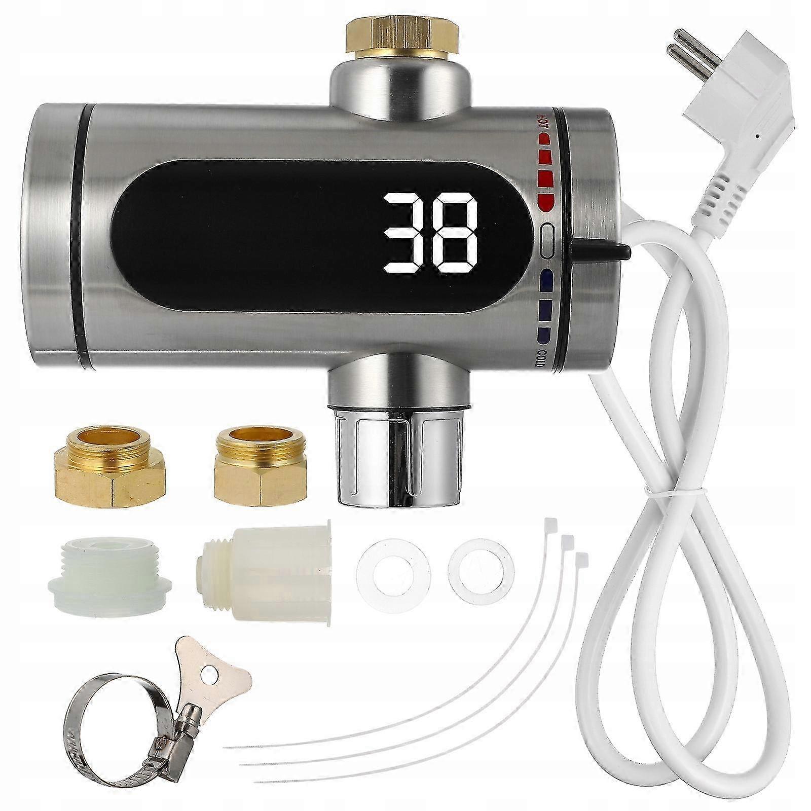 This is a practical tankless electric hot water heater faucet with LED digital display. Coming with a lot of accessories, this electric faucet can be installed quickly, easily, and effortlessly almost anywhere there is a utility connection, just screw on, plug in. It has hot and cold water dual use. You can perfectly use it in kitchen, bathroom, etc. instant hot water heater This electric faucet is made of stainless steel material, which is sturdy, safe and can be used for a long time. With instant hot water, this electric faucet  has no need for long time warmup and no need to store water. And its water temperature is up to 50 degrees Celsius, which depends on water pressure and accessories. instant hot water faucet Rated Voltage: 220V Rated Power: 3000W Rated Frequency: 50HZ Use Water Pressure: 0.040.4Mpa Waterproof Level: IPX4 Power Cable Length: About 1.45m Whether Faucet Rotates: Rotatable Hot Water Production Rate: Instant Heating Color:Silver Material:Stainless Steel Size: 13.80X12.00X12.00cm/5.42X4.72X4.72in instant tankless water heater The water heats up instantly without long delays and no need for cistern, because it has the powerful integrated heating coil. The electric faucet uses LED digital display, allowing you to read accurate temperature at any time. With the help of this electric faucet, you will have hot water wherever you need it for a long time, such as swimming pool, garden, workshop, on your patio, etc. Package List 1 x Electric Water Faucet with Connecting Cable 1 x ½" Adapter 1 x ¾" Adapter 1 x ¾" Plastic Adapter 1 x Universal Adapter 1 x Metal Clip 1 x Small Sealing Ring (½" Adapter) 1 x Middle Sealing Ring (for Water Inlet) 1 x Large Sealing Ring (3/4" Adapter) 3 x Cable Ties 1 x Assembly and Operating Instruction Note:This item comes with EU plug, please confirm the voltage of your area before purchasing.