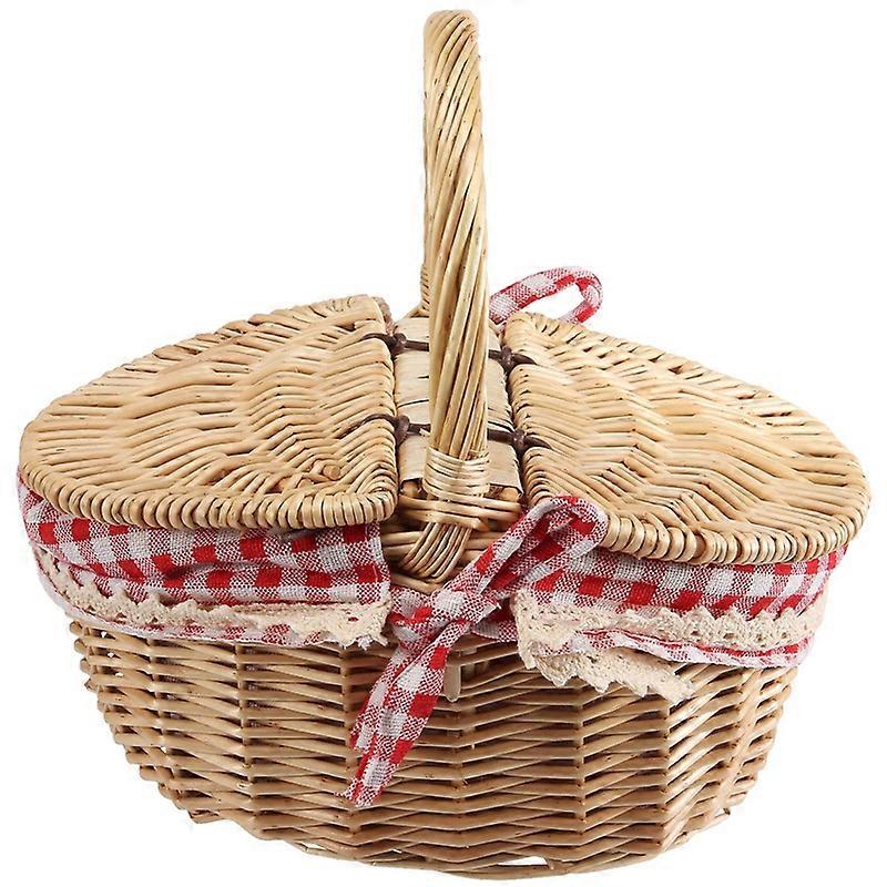 [Premium quality ]non-toxic and eco-friendly , safe and durable for long service time.Comfortable carrying handle makes you more easier to carry, and enjoy your happy picnic time. [Double Lidded Design] With a high carrying handle, round and comfortable to grip without pain . Double lid design makes it more convenient to put in or take out of your food, fruit or other things. [Removable Lining]Removable cotton lining is thickened cotton cloth that is stout,soft and easy to clean ,easy and convenient,beautiful and practical decorative picnic basket. [Elegant design]The Oval Storage Basket features with beautiful appearance . Attractive woven wicker frames paired with linen cotton adds a beautiful elegant look to your room, also a perfect home decoration. [Enjoy Picnic Time]The versatile picnic basket great for picnic,hiking,camping , family gatherings,has large capacity for storing variety of foods, wine and enjoy your happy picnic time. This wicker picnic basket is lightweight yet durable, is full of British rural style. It has exquisite workmanship and lace details, looks very elegance and graceful. Colour:Natural wood color Material:Wicker, cloth Size:Length: 20cm Width: 15cm Height: 13cm Package Contents: 1 x Picnic Basket(With red checkered cloth) Only the above package content, other products are not included. Note: Light shooting and different displays may cause the color of the item in the picture a little different from the real thing. The measurement allowed error is +/- 1-3cm.
