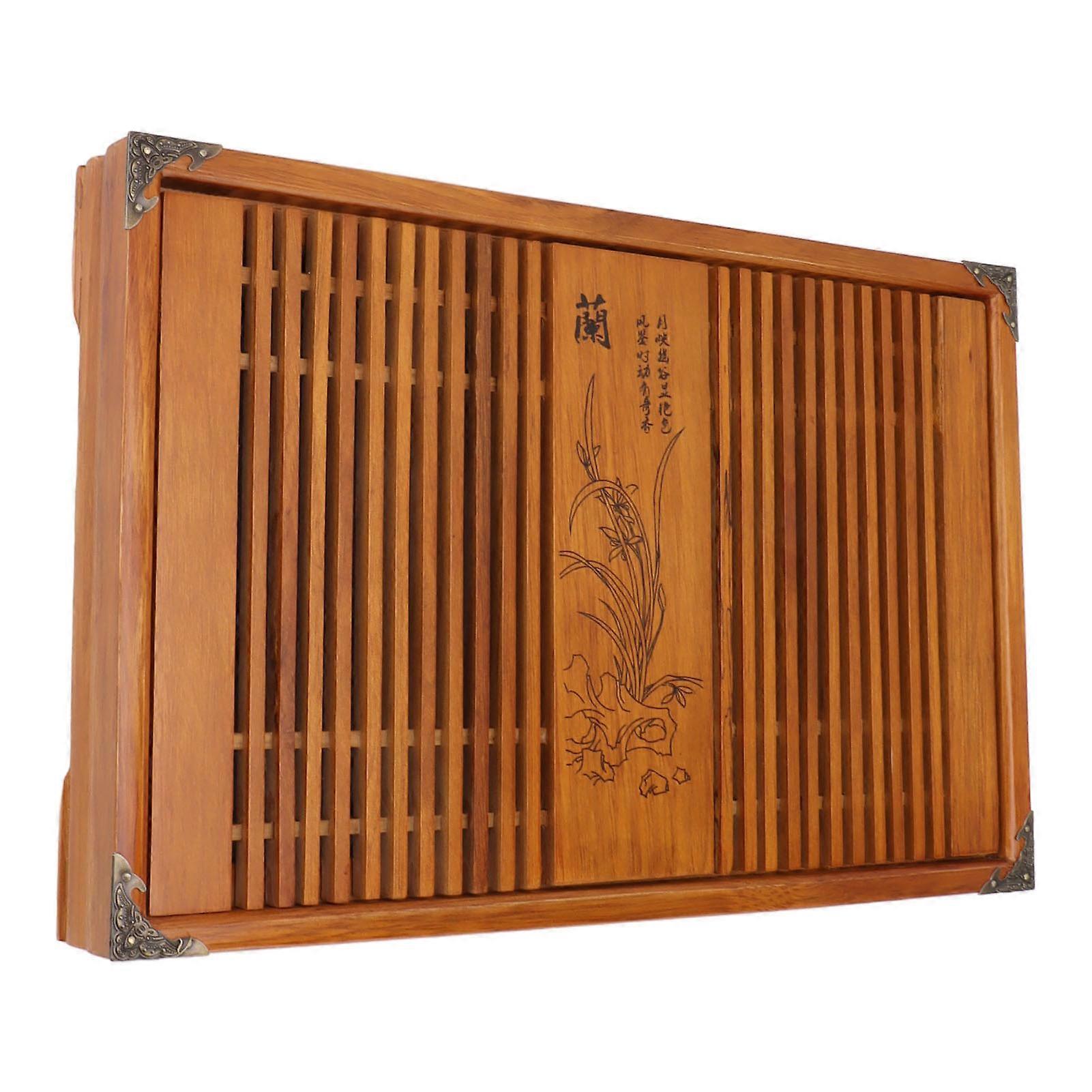 Kungfu Tea Tray Chinese Gongfu Tea Tray Drainage Water Storage Wood Tea Table with Drain Pipe Yellow Orchid