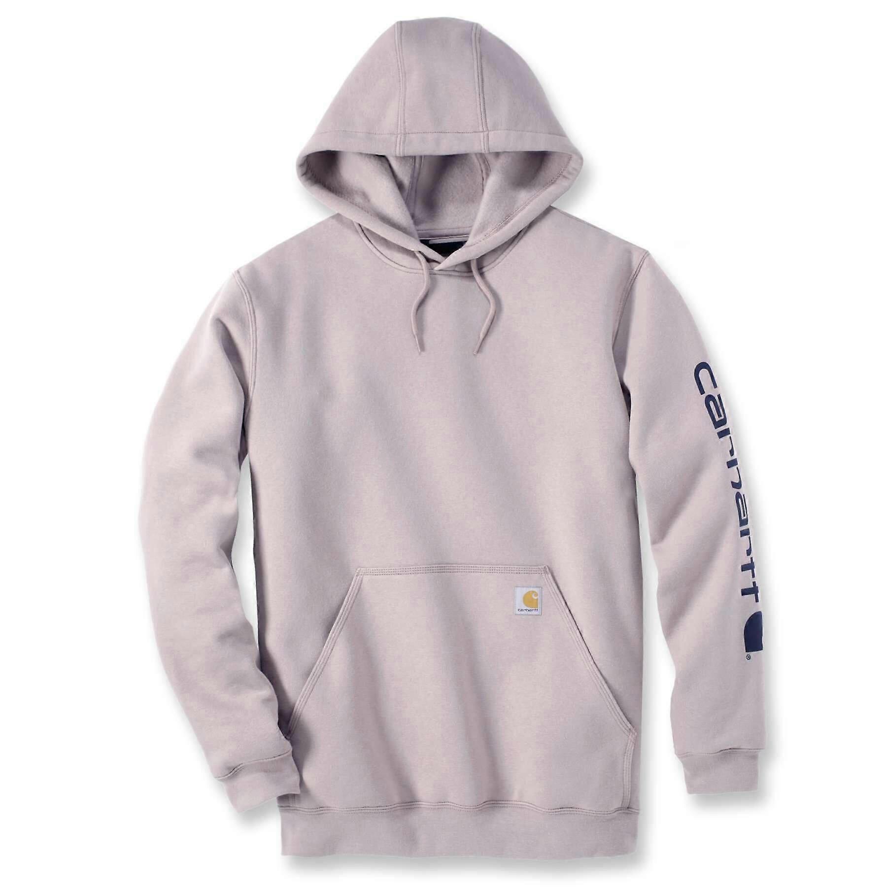 Men's Loose fit Hooded Sweatshirt With Sleeve LogoKey Features and Benefits LOOSE FIT 10.5 oz/yd² - 356 gsm ARBORVITAE HEATHER , BLACK , CARBON HEATHER , CARHARTT® BROWN , CURRANT HEATHER , ELM SPACE DYE , NEW NAVY , PORT 50% Cotton/50% Polyester FROSTED BALSAM HEATHER , MOCHA HEATHER 59% Cotton/41% Polyester HEATHER GREY/BLACK 70% Cotton/30% Polyester MOONSTONE 59% Cotton/41% Polyester Mid Weight Fleece Attached three-piece hood with adjustable draw cord Long Sleeve Stretchable, elastane reinforced rib knit cuffs and waistband Carhartt signature logo printed on left sleeve Carhartt label sewn on pocket What Carhartt say:Cut the morning chill with this men's sweatshirt. A traditional cotton blend makes for versatile layering. Carhartt durability and familiar hoodie comfort mean you can strap on your tool belt or relax with equal ease. A midweight cotton blend offers everyday versatility.