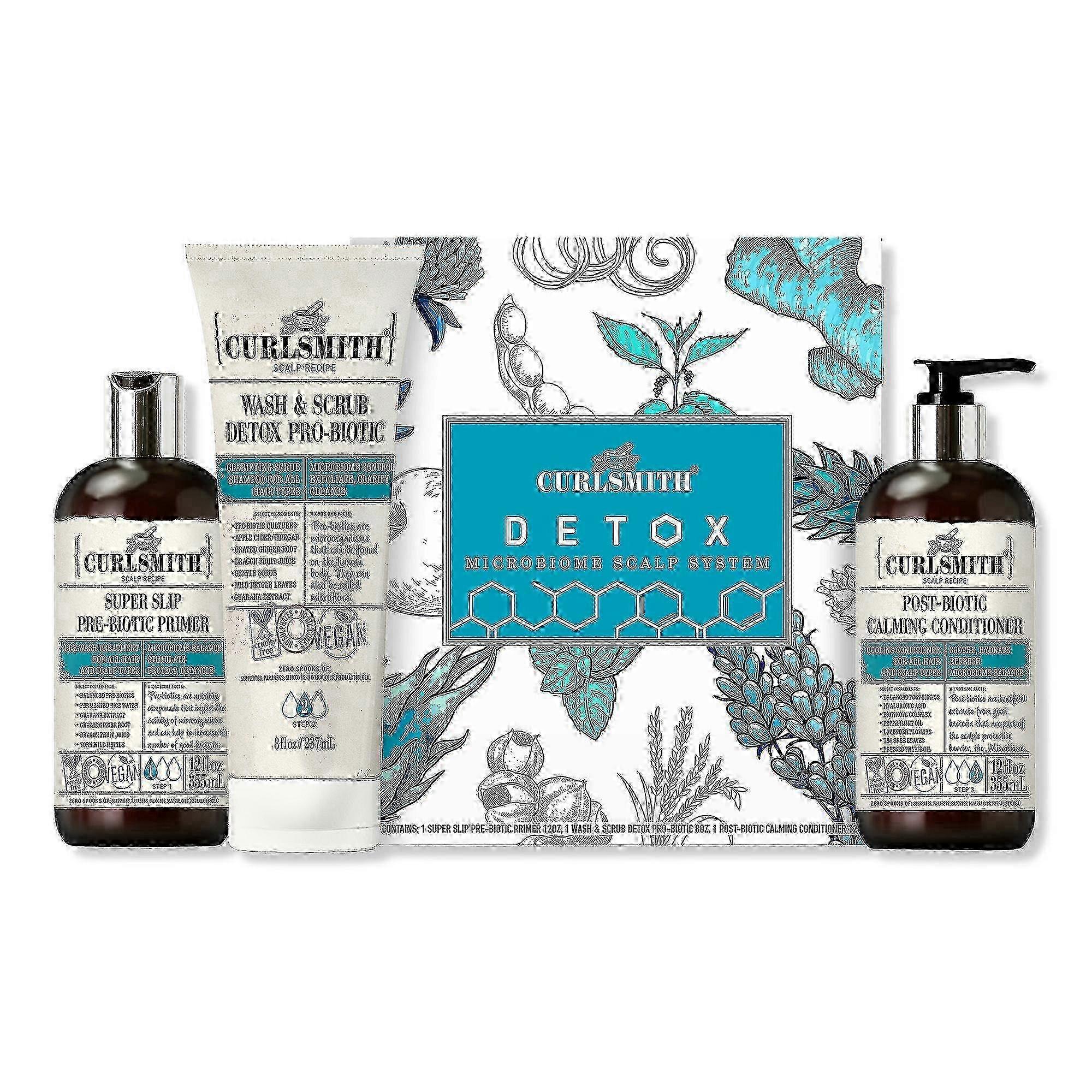 Curlsmith Detox Microbiome Scalp System is a powerful 3-step clarifying routine that helps deeply cleanse the scalp and fortifying its protective barrier.BenefitsClarifying treatments might feel a bit more stripping than regular shampoos, that's why Curlsmith has designed their Microbiome Scalp System in 3 steps to maintain the perfect scalp balance at all timesThe Primer detangles and protects the hair from losing moistureThe Wash & Scrub deeply clarifies, melts build-up and dirt and exfoliates dead skin cellsThe Conditioner rebalances pH and moisture levelsDesigned for all curls and texture types, this product is also suitable for straight hairHelps strengthen the hair's protective barrier, the MicrobiomeKey IngredientsPre-biotics, nutritive compounds that feed the 'good bacteria' which form the skin's protective barrier, the MicrobiomePro-biotics, skin-friendly micro-organisms that help strengthen the scalp's protective barrier, the MicrobiomePost-Biotics, beneficial extracts from 'good bacteria' which help regulate the skin's protective barrier, the MicrobiomeFermented Rice Water, which has been used for centuries in Asia as a hair treatment to keep the hair healthy, detangled and cleanApple Cider Vinegar to help melt dirt and build-up, clarify the hair and enhance shinePerlite, an incredibly fine natural scrub derived from volcanic minerals, which effectively exfoliates the skin without leaving residuesPeppermint & Tea Tree essential oil blend to refresh and cool down the scalpHyaluronic Acid, known as a miracle ingredient in skincare: just one gram of it can hold up to 6 liters of water, which makes it perfect to give moisture without weighing the hair downBiotinoyl, unique complex that promotes fuller, denser-looking hairSoothing blend of Green Tea, Lavender, Thyme, Witch Hazel, Amla and CedarwoodEnergizing blend of Ginger, Nettle, Dragon Fruit and GuaranaIncludesSuper Slip Pre-Biotic Primer (12.0 oz)Wash & Scrub Detox Pro-Biotic (8.0 oz)Post-Biotic Calming Conditioner (12.0 oz) Inactive Ingredients: Carnation: Cyclopentasiloxane, Synthetic Wax, Polyethylene, Isohexadecane, Dimethicone, Isododecane, Silica, Trimethylsiloxysilicate, Triisostearin, Lauroyl Lysine, Glycerin, Sorbitan Sesquiisostearate, Cetearyl Dimethicone Crosspolymer, Trimethylolpropane Triethylhexanoate, Jojoba Esters, Tocopherol, Helianthus Annuus (Sunflower) Seed Wax, Rubus Idaeus (Raspberry) Seed Oil, Ribes Nigrum (Black Currant) Seed Oil, Helianthus Annuus (Sunflower) Seed Oil, Rosmarinus Officinalis (Rosemary) Leaf Extract, Acacia Decurrens Flower Wax, Adansonia Digitata Seed Oil, Squalane, Caprylic/Capric Triglyceride, Limonium Gerberi Extract, Polyglycerin-3, Isopropyl Titanium Triisostearate, Aluminum Hydroxide, Disteardimonium Hectorite, Polysilicone-2, Propylene Carbonate, Phenoxyethanol. May Contain: Mica, Titanium Dioxide (CI 77891), Iron Oxides (CI 77491, CI 77492, CI 77499), Blue 1 Lake (CI 42090), Red 6 (CI 15850), Red 7 Lake (CI 15850), Red 28 Lake (CI 45410), Red 33 Lake (CI 17200), Yellow 5 Lake (CI 19140), Yellow 6 Lake (CI 15985). Suggested Use: Super Slip Pre-Biotic Primer: Apply on wet hair, gently massaging it on the scalp. While the pre-biotics are working, make your way down the hair lengths, finger detangling. Do not rinse off. Wash & Scrub Detox Pro-Biotic: Apply over the Primer - the first will protect your scalp while the Scrub clarifies it. Massage vigorously to break down dirt and buildup. Rinse off thoroughly.