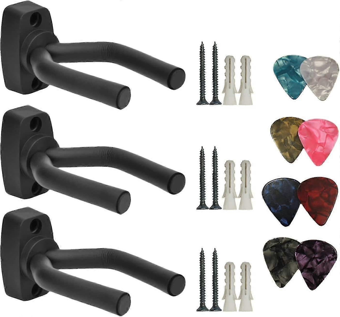 Guitar Wall Mount Hooks 3 Pieces Comptiable With Acoustic Guitar, Ukulele, Bass, Mandolin And Banjo Wall Mount Easy To Install Black With 8 Picks