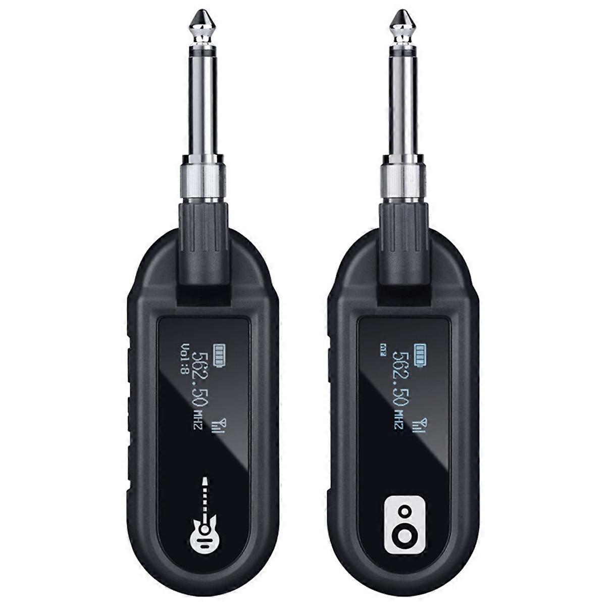 Wireless transmitter & receiver set for electroacoustic musical instruments like guitar, , etc. Built-in rechargeable lithium battery, long working hours Plug and play, simple to use; compact size and , easy to carry. This device is suitable for use with a wide range of electric musical instruments, including electric guitars, basses, drums, and violins. No matter what type of instrument you play, this device can help you connect with your audience and take your music to level. Color: Black Material: ABS+Metal Package Contents: 1 X Transmitter 1 X Receiver Only the above package content, other products are not included. Note: Light reflection and different displays may cause the color of the item in the picture a little different from the real thing. The measurement allowed error is +/- 1-3cm.