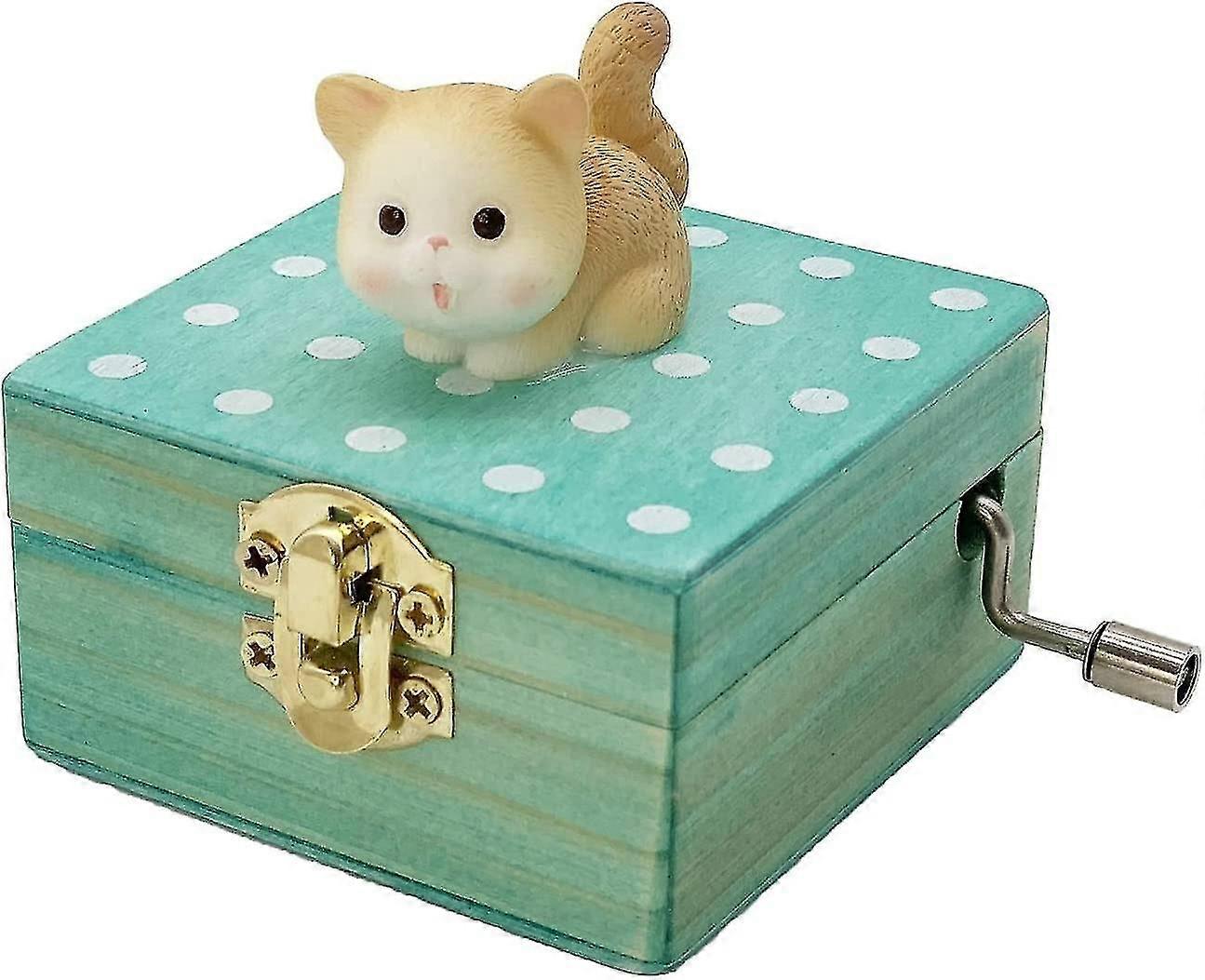 Keep cranking the handle to play music, no battery.The crank is easy to move and kids can do it without difficulty.Mini size and could be placed in the palm of the hand.Cute cat s, vivid and lifelike.Gift wrapped, we pack each product with beautiful wrapping paper and tied with a cute bow to make the gift more ceremonial.