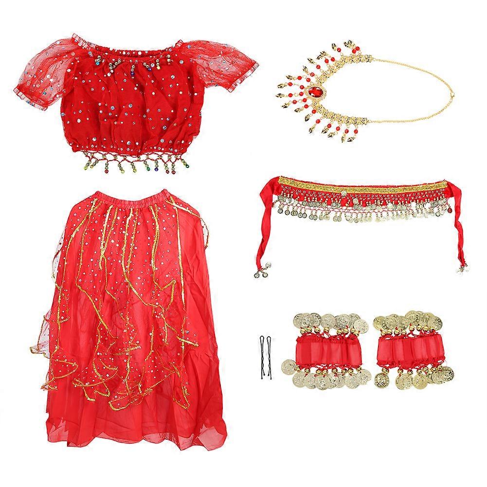 Kids Girls Belly Dance Costume Set Long Dress Outfit Indian Dance Clothing (Red L)