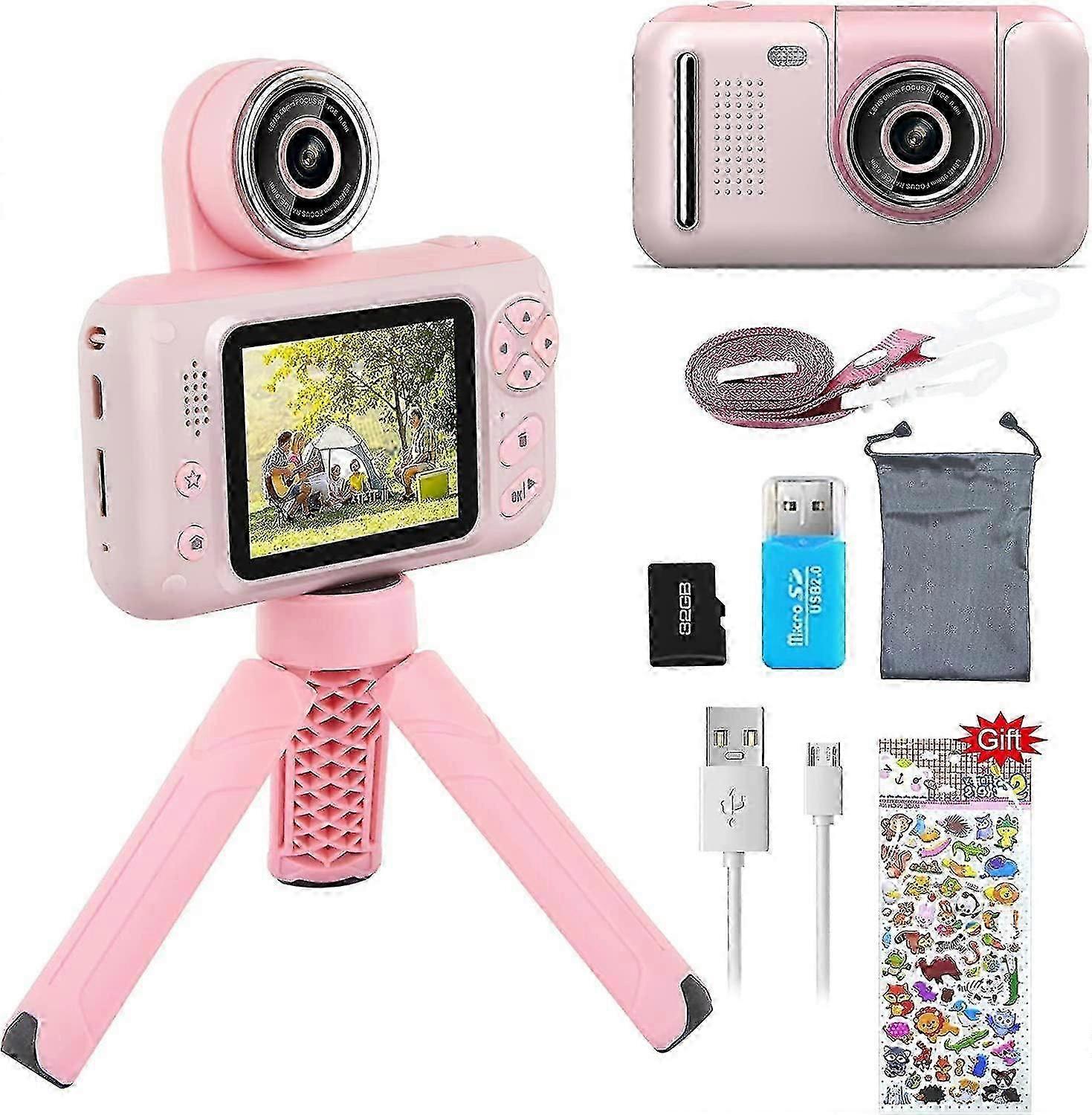 180 REVERSE LENS & 2.4 INCH SCREEN: Kids camera is equipped with 180 rotating lens, which photo resolution is 40 megapixels and 1080P video, greatly improve the definition of photos . It also comes with a tripod in the package, it allows kids to adjust the photography angle and capture the wonderful happy moment.MULTI FUNCTIONS: The kid's camera has various functions, such as video playback, selfie, continuous photo shooting, auto focus, time delay photography, date setting, 3 fun games, etc. Moreover, the kids camera has 17 fun frames and 5 types of filters, making the most of their creativity and imagination to fulfill a little photographer's dream.BATTERY RECHARGEABLE 800MAH & HIGH CAPACITY 32GB: This kids camera is equipped with 800mAh rechargeable lithium battery, and kids can use the camera for 3-4 hours. It comes with a 32G TF card which can store thousands of photos. Never worry about running out of battery Connect to computer via USB cable to transfer photos/videos or recharge the camera in 2-2.5 hoursSAFE & SHOCKPROOF: This kids camera adopts the super soft plastic shell, non-toxic and safe, gives you a comfortable touch feeling; It uses shockproof materials, which can prevent it from breaking when falling. The compact size makes the camera easy to carry anywhere (a portable bag is provided) and a durable lanyard designed for kids to hang the mini camera around their neck.GOOD GIFT & LIST OF PACKAGES: Kids camera is a perfect gift for boys and girls aged 3-10. The kit includes: 1 x Kids Camera, 1 x Tripod, 1 x USB Charging Cable, 1 x 32GB Memory Card (already inserted in the camera), 1 x Card Reader, 1 x Portable Bag, 1 x Lanyard, 1 x packing box, 1 x English user manual.