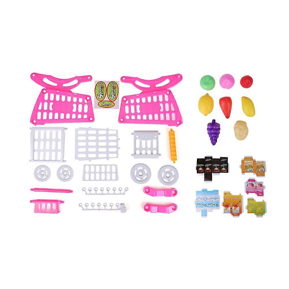 Kids Shopping Cart Toy Children Pretend Role Play Food Fruits Playing Game(Rosy Red with Food)