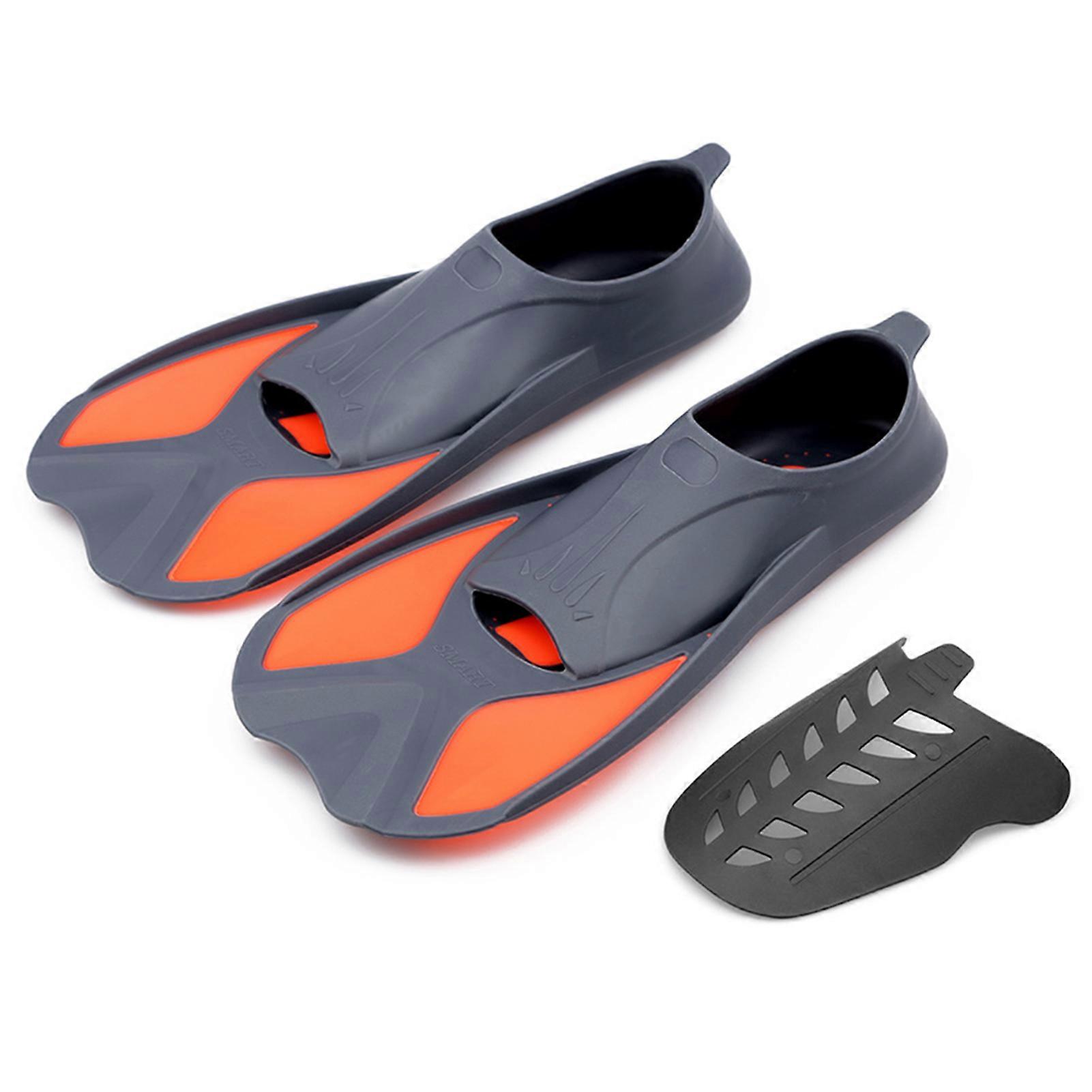 Enhance your swimming performance with these high-quality swim fins crafted from flexible and comfortable TPR material. Designed with a short fin blade, these fins are ideal for both swimming and training, providing excellent propulsion with minimal effort. The high-strength blade ensures efficient movement through the water, helping swimmers improve speed and technique. Key Features: · Flexible and Comfortable TPR Material: Offers durability and comfort for extended use in the water. · Short Fin Blade Design: Perfectly suited for swimming practice and training sessions, promoting effective propulsion. · High-Strength Blade: Delivers powerful thrust while requiring less effort, enhancing swimming efficiency. · Open Foot Pocket: Allows water to drain easily and reduces drag, improving overall swimming performance. · Anti-Skid Sole Grippers: Provide maximum traction on wet surfaces, ensuring safety when walking poolside or on slippery ground. · Included Shoe Stretchers: Help maintain and preserve the shape of the fins for long-lasting use. Specifications: · Material: PP + TPR · Color Options: Grey & Orange / Yellow & Blue · Size Options: 4XS (EU 30-31), 3XS (EU 32-33) Package Includes: · 1 Pair of Swim Fins These swim fins combine comfort, durability, and performance to support swimmers of all levels in training and recreational swimming. Their ergonomic design and quality materials make them a reliable choice for improving propulsion and enhancing your aquatic workouts.