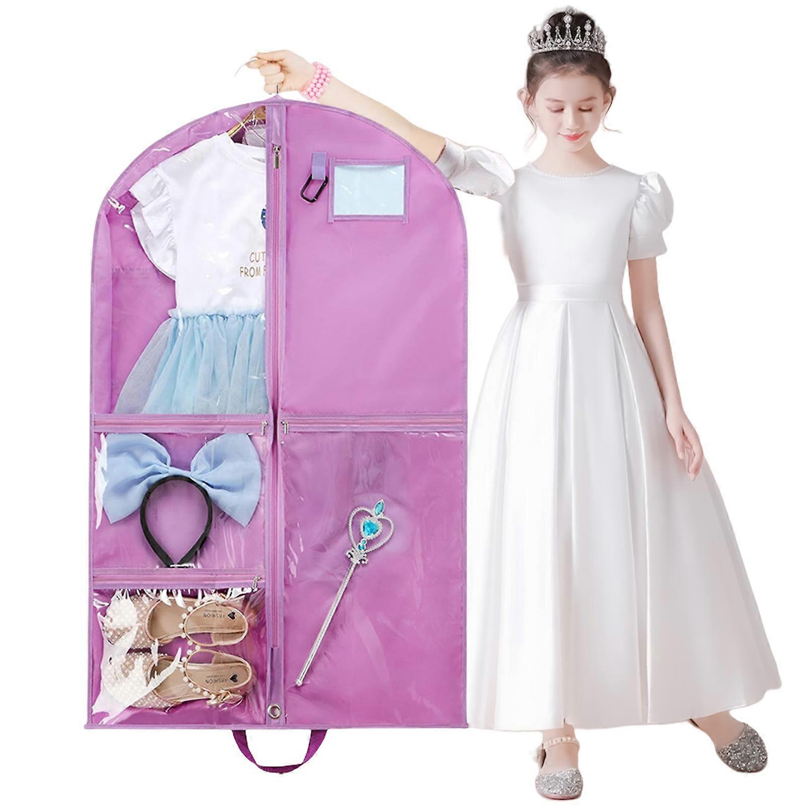 Kids Dance Costume Storage Bag Waterproof Garment Cover with 5 Zippered Pockets Foldable Travel Dress Organizer Purple