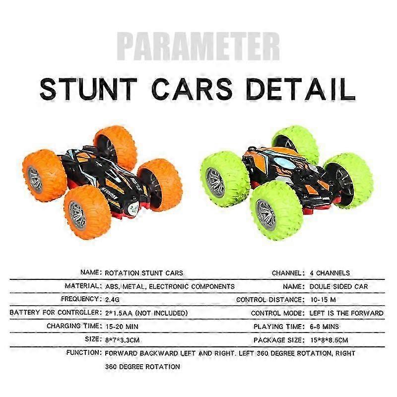 Description: Product name: Stunt car series Packing: window box Color: picture color Frequency: 2.4G Product battery model: 2.49/50nah Ni-nh Remote control battery: 2 1.5AA (not configured) Charging time: 15-20 minutes Use time: 16-8 minutes Remote control distance: 10-15 meters Certificate: ENT1 EN62115 RTTE ROHS.7P Accessories: USB charging cable, manual Product specifications: 80*70*33mm Color box specification: 15*&8*8.5cm Specifications: 1.2.4GHz radio technology, the control range can reach 40 meters. 2. Elastic foot springs, high-quality rubber wheels, non-slip, perfect experience. 3. The front-end anti-collision design can greatly reduce the damage to the front motor of the remote control car. 4. Large torsion angle, easy to deal with various terrains. 5. Applicable terrain: soil, grassland or sandy soil. 6. Newly designed cool remote control; Package Included: 1*Remote control car 1*Remote control 1*Charging cable 1*Instruction