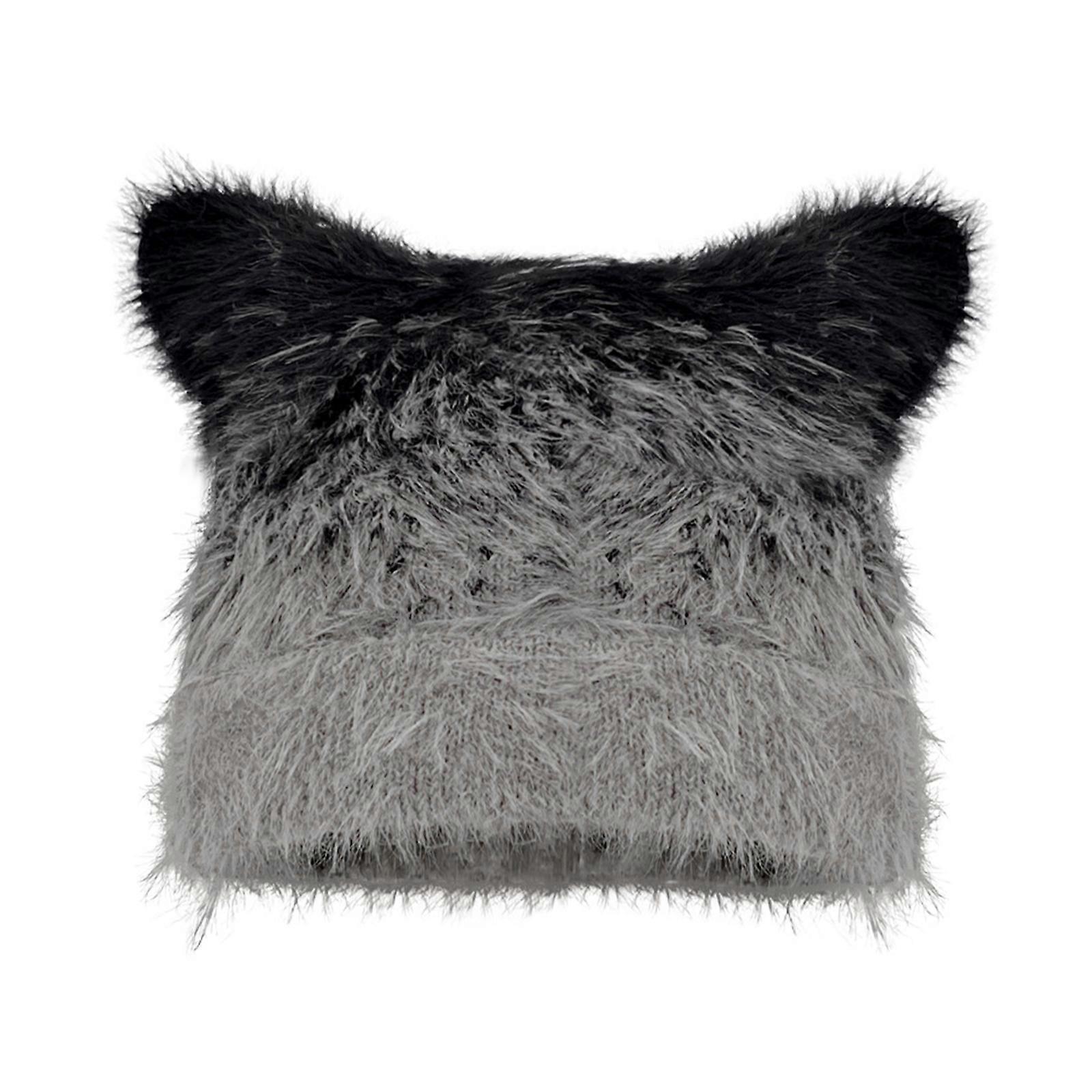 Kids Knit Head Wrap Thicken Furry Kitten Hat for Climbing Skiing Sports Headwear White Kitten Hat Oversized Headwear Black and gray