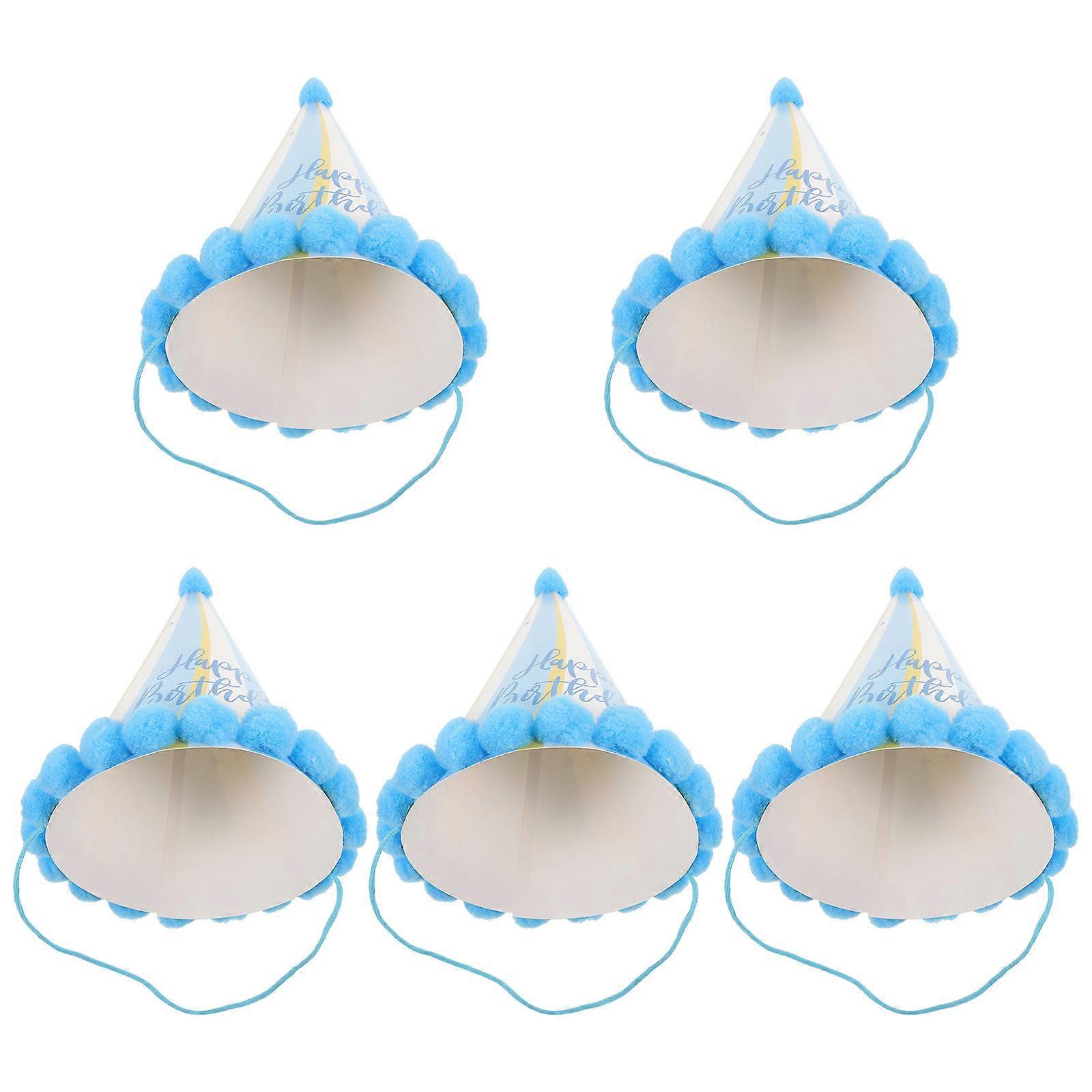 Kids Party Paper Headwear Light Blue Cone Shape Pompon Hats Shiny Surface Birthday Party Hat Decorations 5Set