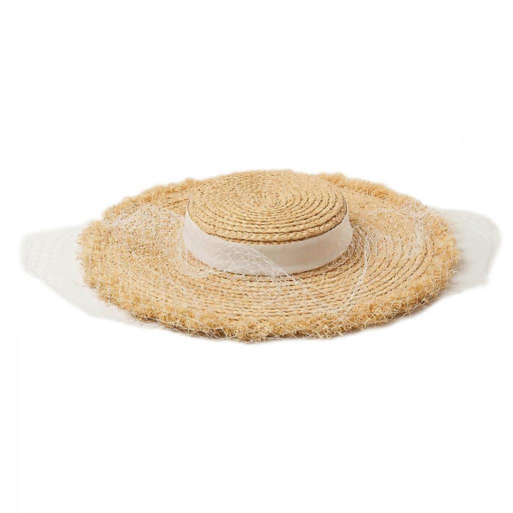 Kids Boys Girls Summer Shallow Flat Top Straw Hat Wide Brim Banded Lace Ribbon Chin Strap for Sun for Protection Beach C White mesh white bu