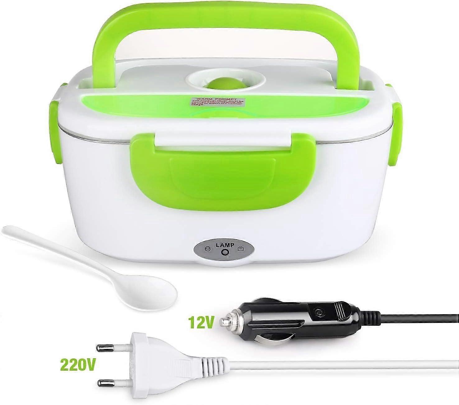 2 IN 1 ELECTRIC LUNCH BOX FOR CAR AND HOME - Dual voltage 220 - 12 V. Ideal for heating meals on the go or in the office. GOODBYE TO FAST-FOOD - Food can be heated up to a maximum of approximately 70°C and it automatically stays hot when heated to 70°C VOLUME 1.5 LITERS - In the electric lunch box with a volume of approximately 1.5 liters. Put on some treats, turn on the power and lunch is ready REMOVABLE CAN WITH LID - the spoons in the lid of the thermos container and the removable box with lid for side dishes or dessert make the lunch box a small miracle of pleasure. EASY TO CLEAN - Removable seal for better cleaning. The lid of the heating box, the cutlery, the jar with lid and the removable stainless steel container are dishwasher safe. For a delicious lunch on the go Dual voltage: 110-220V (household) 12V (car) Material: food-grade PP plastic + 304 stainless steel Estimated capacity: 1.1-1.5 L (large container 1.5 L, small container 0.45 L) Recommended heating time: 45-50 minutes (depending on food temperature) Scope of delivery 1 x electric food warmer