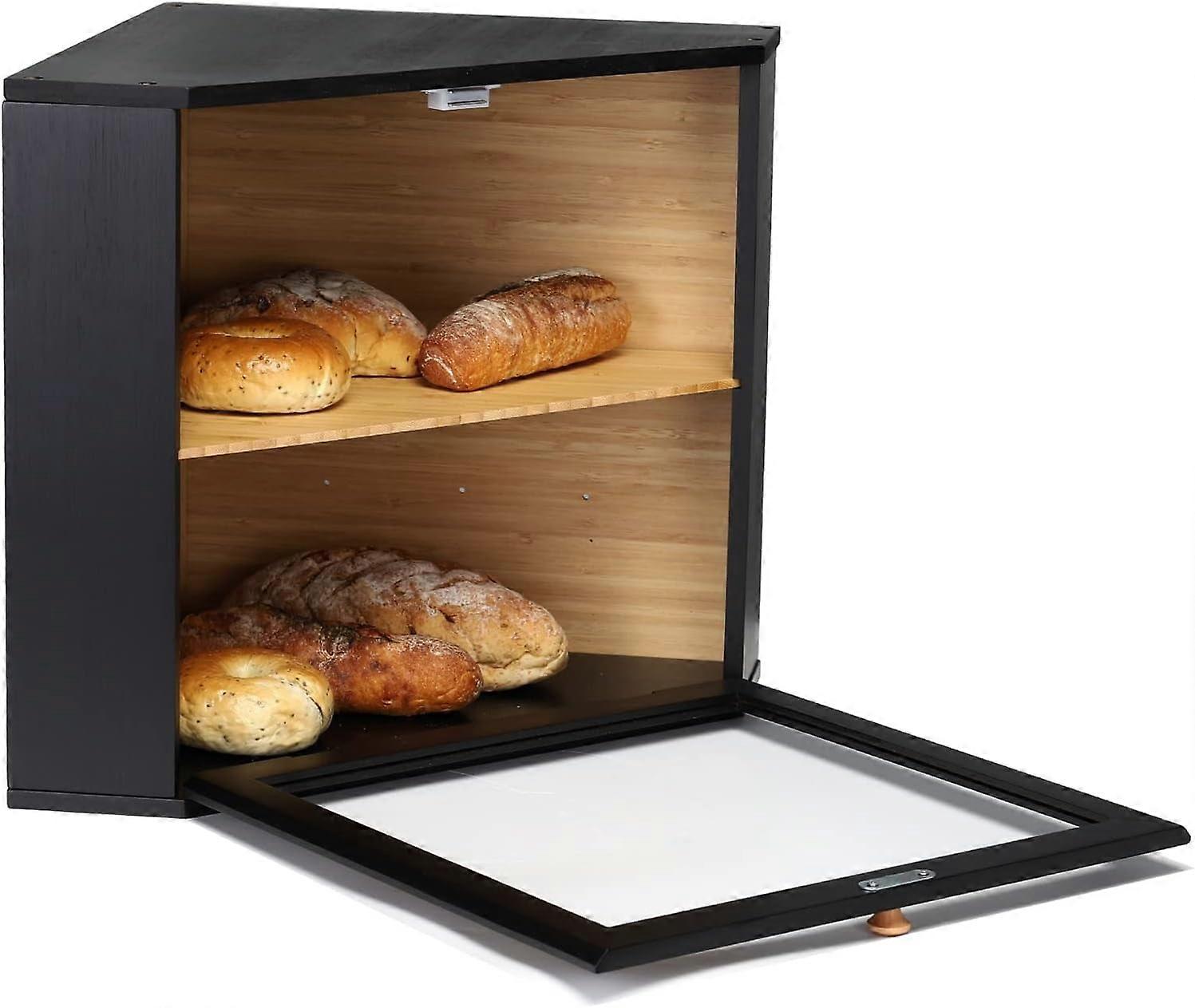 Product DescriptionHOMEKOKO Large Double Layer Corner Bamboo Bread Box - Gorgeous Choice for Kitchen Food Storage! ASSEMBLY INSTRUCTION Â Dimension: 13.4 x 12.6 x 12.6 inches Net Weight: Â4.85 LBs Food Grade Natural Bamboo Material:Â [ KEEPS BREAD FRESH ] Unlike airtight containers that quickly dry out and stale the bread, our bread saver box retains just enough moisture to keep most bread fresh for up to 3 or 4 full days and prevent your bread inside from any unnecessary air when you just want to check out your options [ CORNER RIGHT-ANGLE DESIGN ] Our bread box has a right triangle configuration which could perfectly fit the spare corner space on your kitchen counter. Also, this bread box could effectively save your space, and the top of the bread box is available for you to put more kitchen stuffs on it. [ LARGE CAPACITY ] While other bread boxes can only hold 1 loaf of bread, our 2 layers board is large enough to hold 2 large loaves of bread, rolls, muffins and more, which will avoid effectively deformation of bread caused by extrusion [ VISUALIZED DESIGN ] A clear plexiglass window is built in so you can easily see everything inside. This keeps you updated on when you need to buy or bake more and stops you from allowing any unnecessary air to enter when you just want to check out your options. [ STURDY, STYLISH, EASY ASSEMBLY ] Itâs an ideal choice to store and display your bread and baked goods inside this kitchen countertop bread keeper that are made of strong bamboo wood; its farmhouse chic style will add to your homeâs rustic decor. Screwdriver is included in the package for easy assembly. Patented product(s), counterfeiting is not allowed. Â