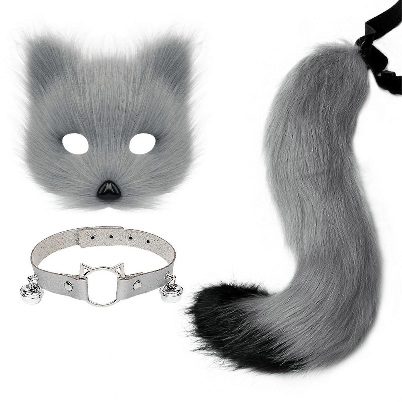 Foxes Costume Kits Foxes Tail Adjustable Tail and Foxes Mask Bells Collar Animal Tail Halloween Cosplay Accessories Gray set