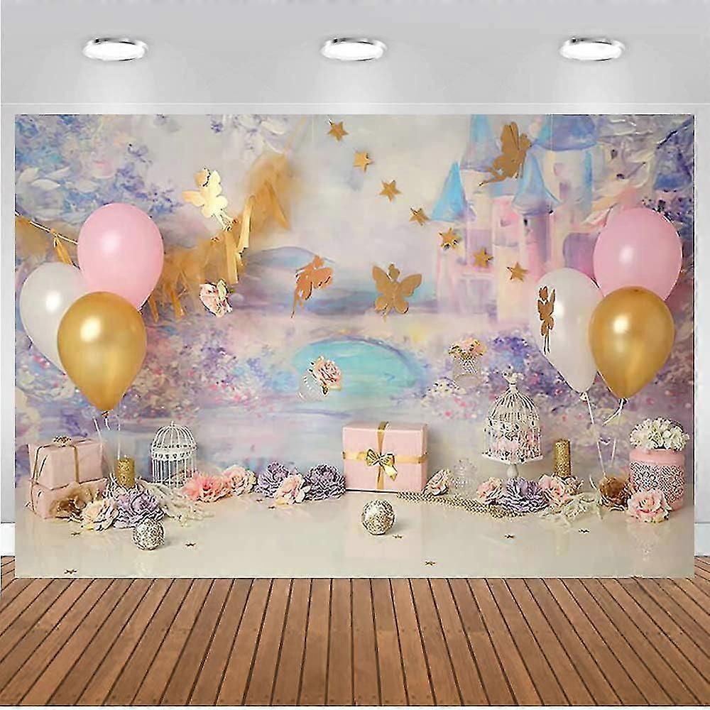 Castle Princess Birthday Theme Flower Fairy Backdrop For Cake Smash Photography Newborn Kids Portrait Spring Butterfly Decor (7x5ft/2.1x1.5m)