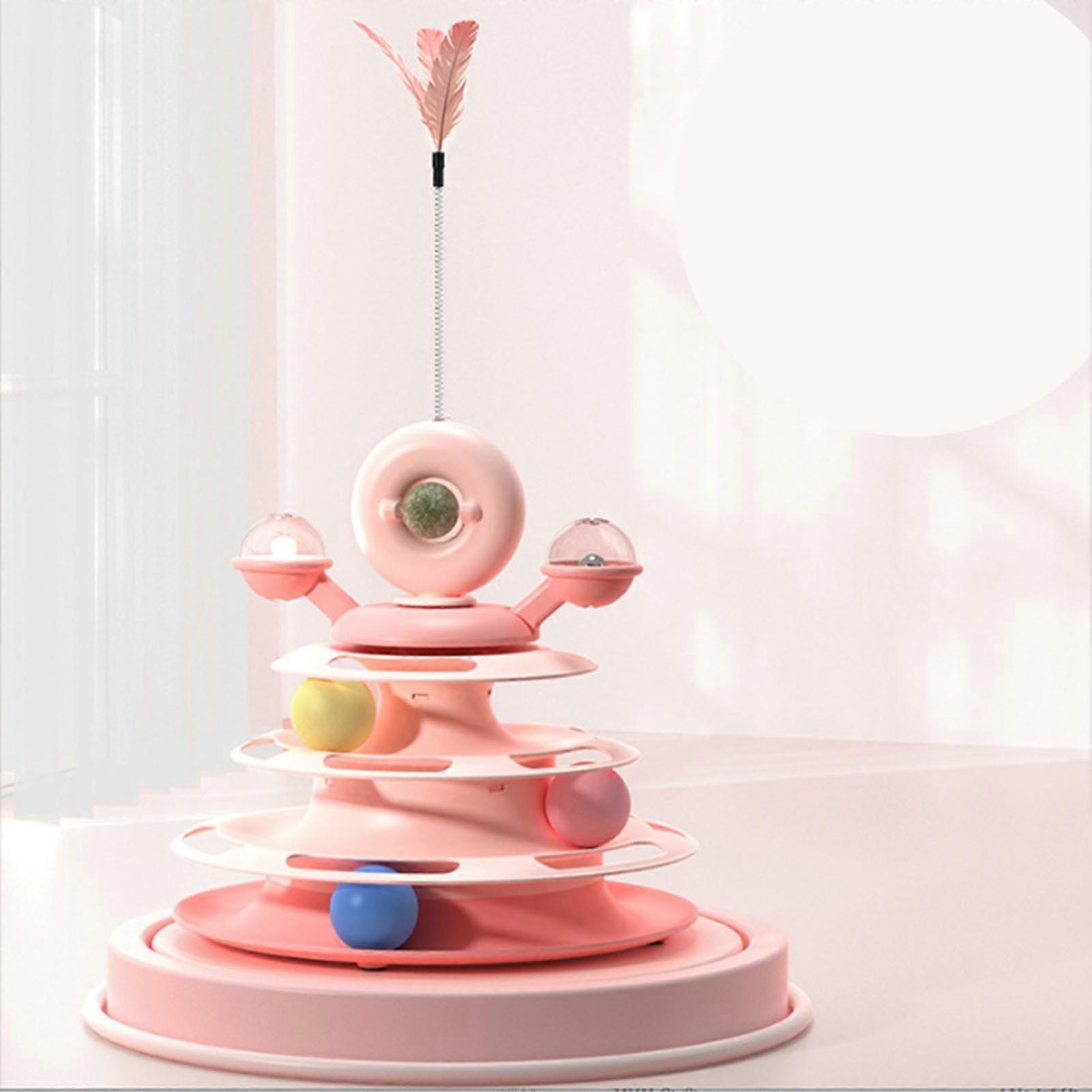 Cat Ball Tower Toy with Feather Catnip 4 Layer Rail Pet Turntable Game for Exercise Pink