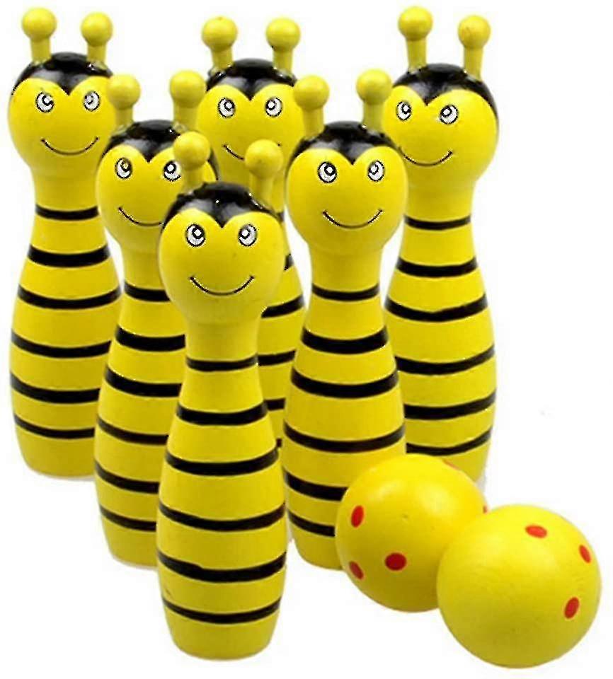 Cartoon design, frog, bee, cow, kids loves animals.Package includes 6 pieces of bowling and 2 pieces of ball.Material made of wood.Color: white, green, red, yellow.Children can play with other children together, strengthening the ability of communication and cooperation.