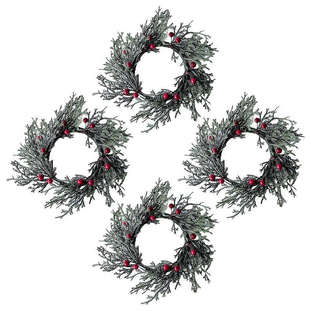 Candle Rings Pillar Candles Christmas Decor Red Berries Snowy Pine Needles Garlands 4Pcs